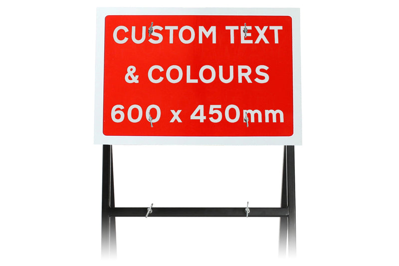 Our custom road traffic signs are available with your choice of fixing. Whether you need a barrier-mounted version, a cone-mounted version, or a metal frame, we’ve got you covered!