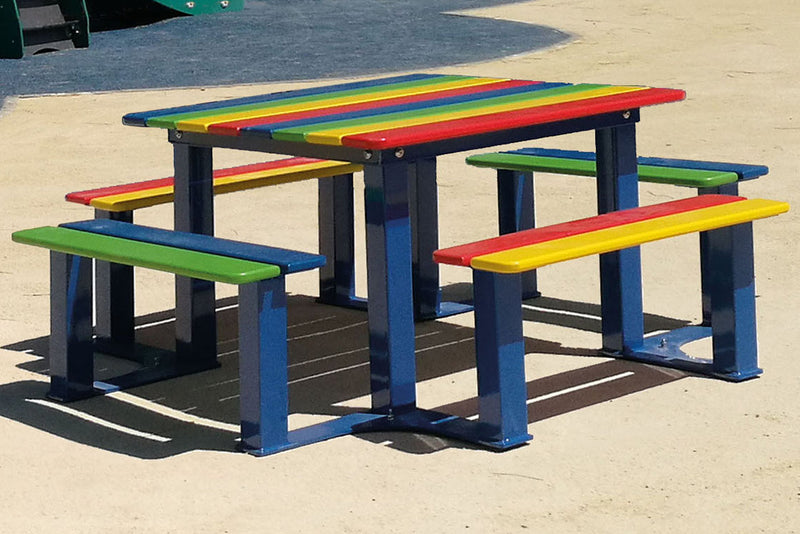 Our range of children's outdoor benches is designed to be engaging, easy, and safe to use. Usually, benches for schoolchildren are available at several different seat heights, with a distinction made between nursery and primary school kids (due to height and difference in coordination ability).