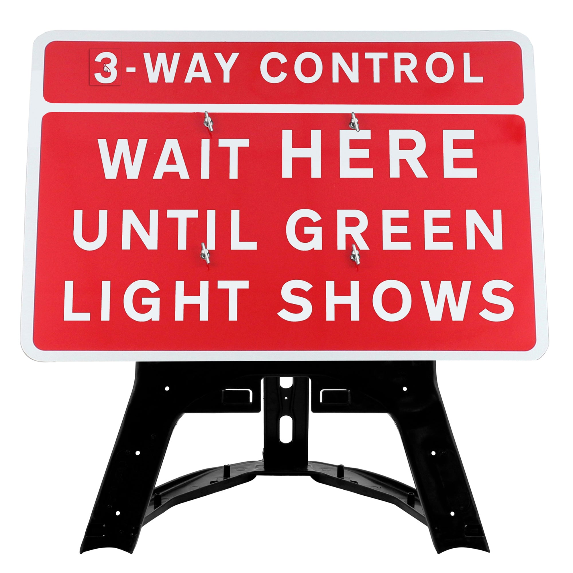 This 3/4 Way Control Wait Here Until Green Light Shows 7011.1 QuickFit Endurasign is perfect for use when traffic control systems are regulating traffic from three or four directions. This sign face features a small panel that can be turned over switching the face from three to four-way control, great for use with temporary traffic lights.