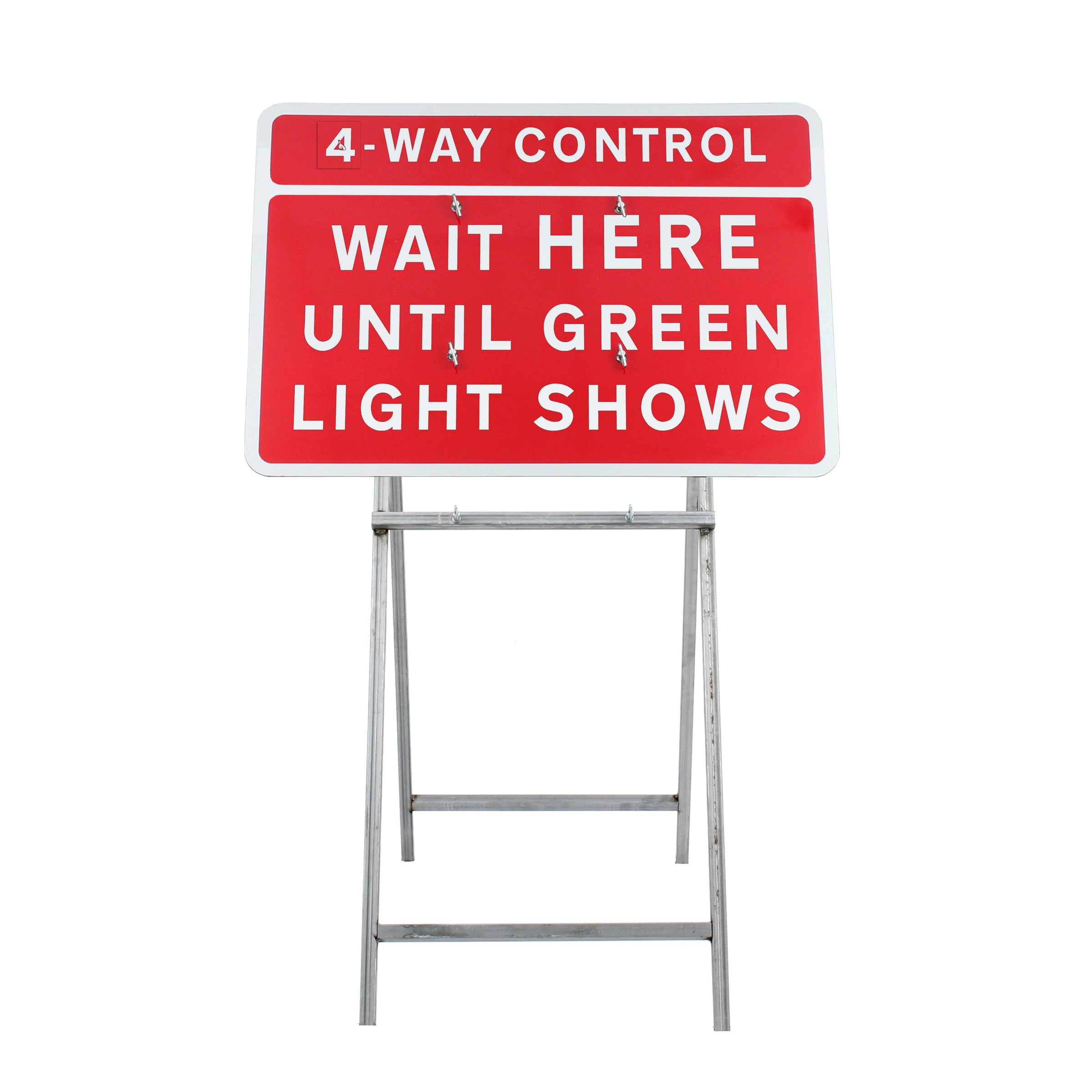 This Quick Fit ‘3 / 4-WAY CONTROL WAIT HERE UNTIL GREEN LIGHT SHOWS’ has a flip-over cover plate to indicate either ‘3-way’ or ‘4-way’ control. These are used when road works have to stop side roads as well as the main carriageway.