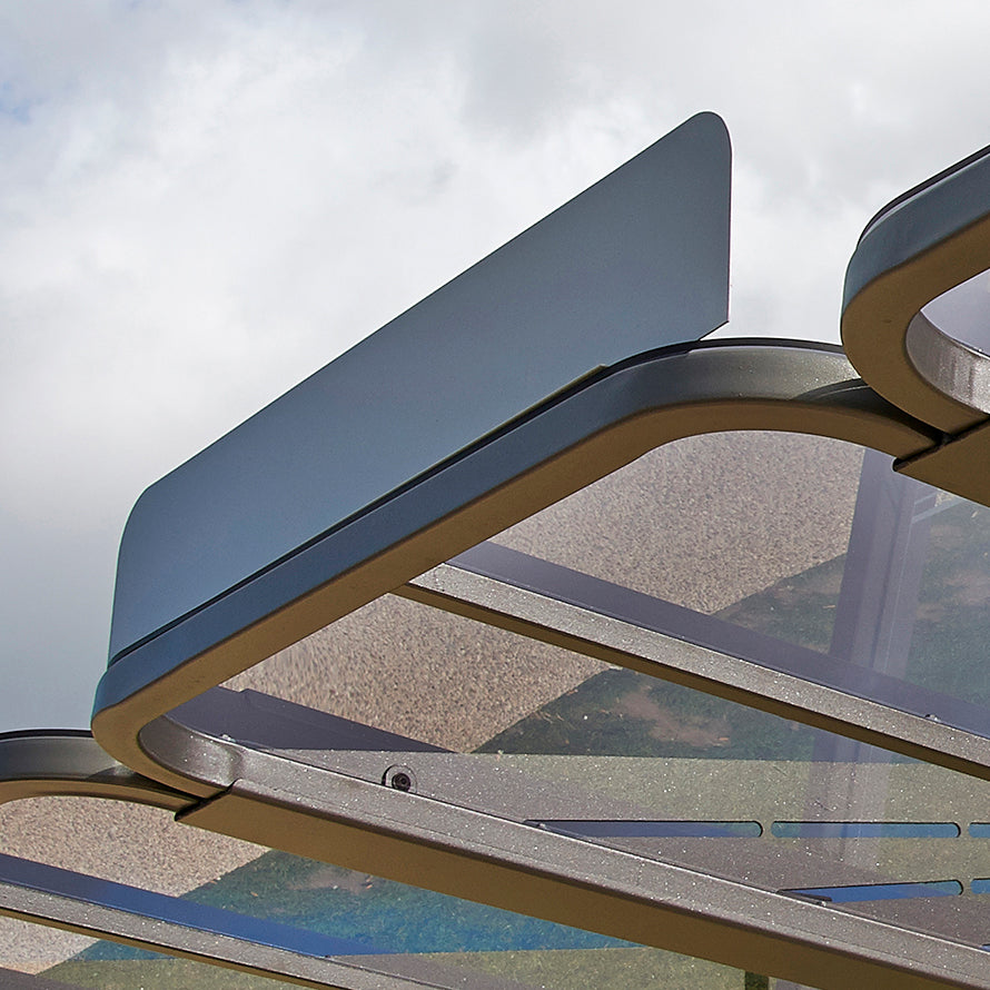 Attached to the front of a Procity Conviviale Bus Shelter section's roof, this supplemental bus stop name sign allows extended shelters to integrate extra signage for better user guidance.
