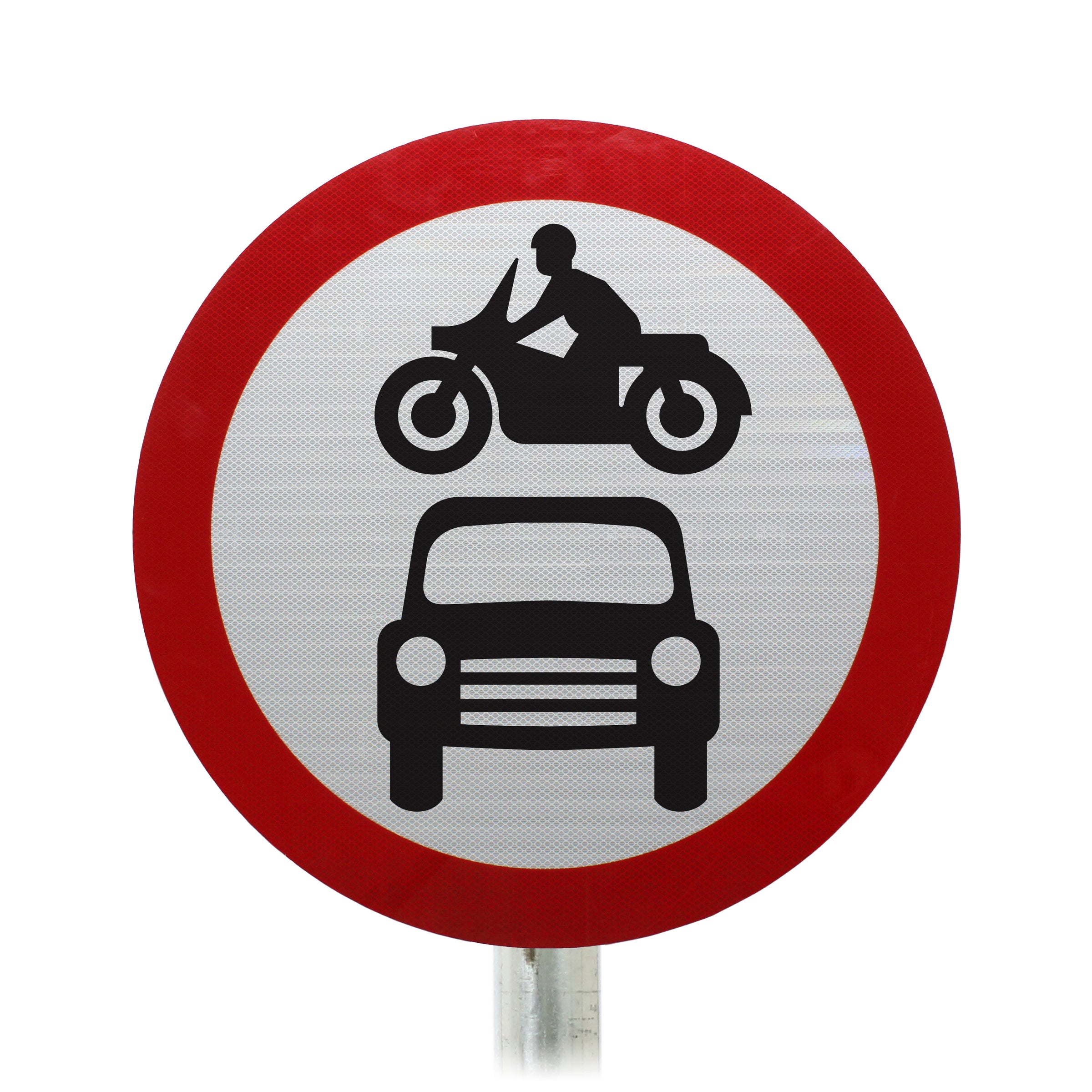 The bike and car regulatory sign is designed to prevent road use for all motor vehicles. This doesn't include bicycles or horse-drawn carriages as these don't pose enough threat to pedestrians. If your area should be restricted from all vehicles, diagram 617 is the "All Vehicles Prohibited" sign. If the road allows motorcycles, scooters or mopeds then "All Motor Vehicles Except Solo Motorcycles Prohibited"- 619.1 will be more appropriate. Or, 619.2- "Solo Motorcycles Prohibited" prevents only motorcycles, moped and scooters.