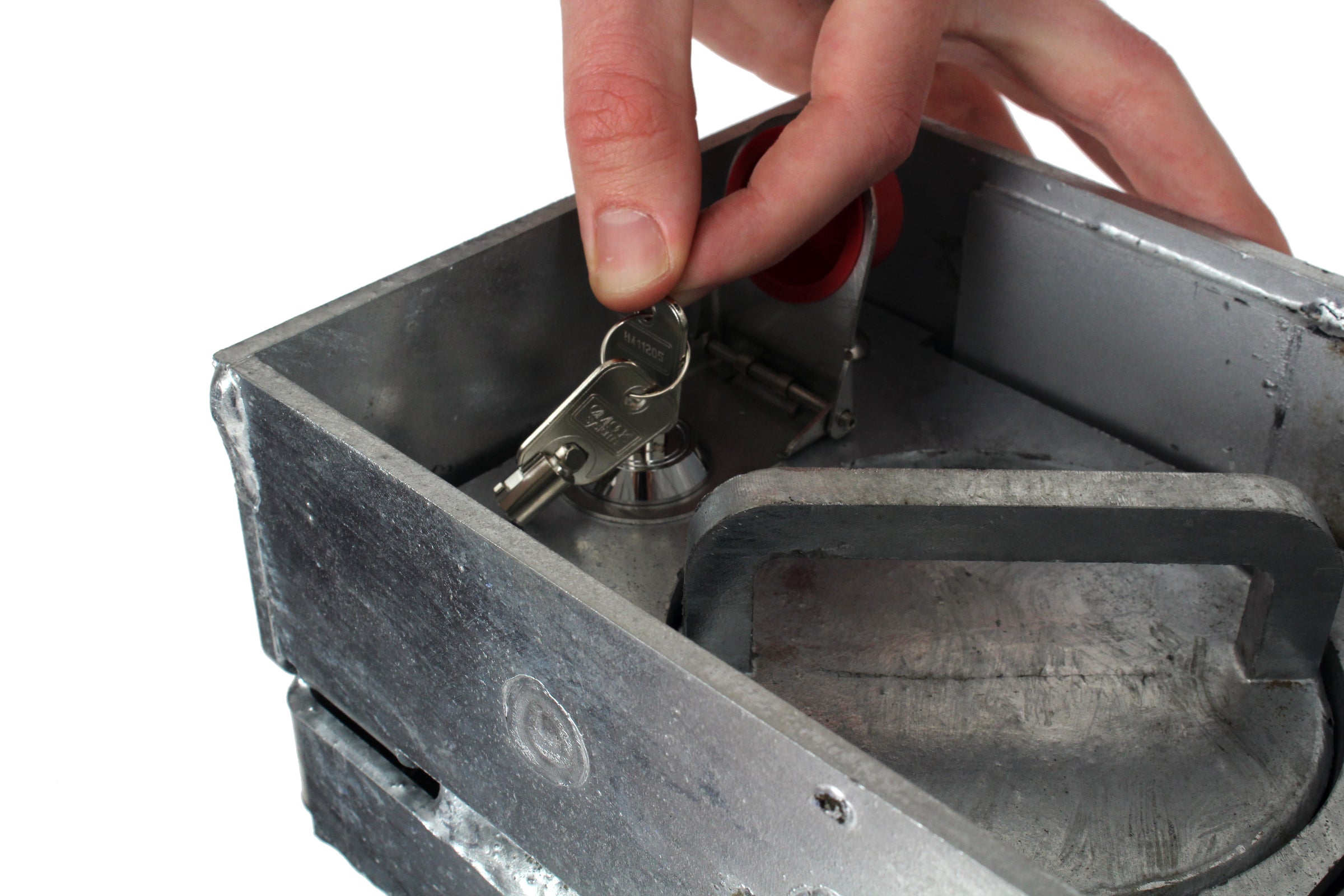 The GL range works in very much the same way as the standard RetractaPost. To raise the post, you first need to lift the cover plate on the ground socket. The red keycap can then be lifted; this cap protects the integral lock from water ingress. The post can then be lifted to its full height and rotated by 45 to latch it in place. The lock is then used to secure it in this position.