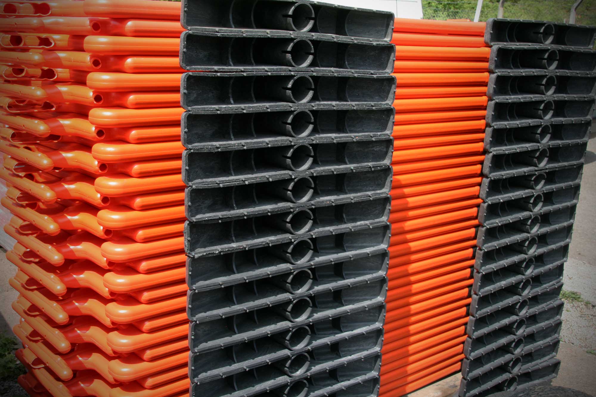 They are easily stackable with interlocking notches on each end of the barrier, creating a compact, stable stack. This tight stack ultimately reduces the amount of space they take up when stored away for future use or when loaded onto a vehicle for transportation. A single pallet can hold up to 50 barriers stacked together.