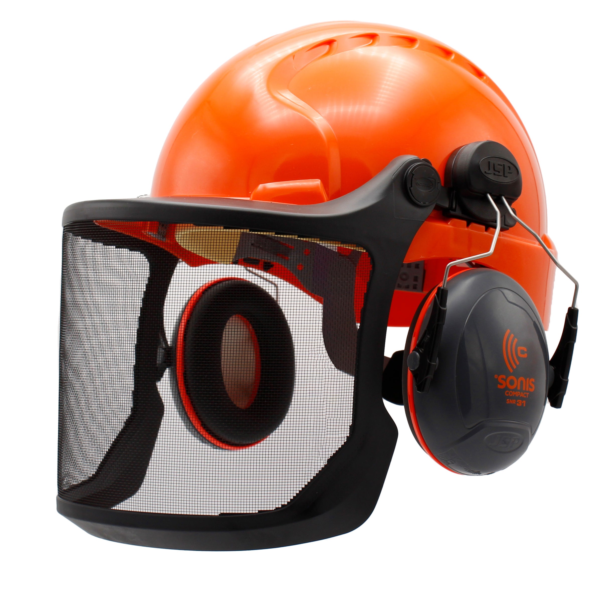 Our basic chainsaw helmet kit is a nifty upgrade from the JSP EVO3 Forestry helmet kit. It comes complete with SONIS compact helmet-mounted ear defenders and their new M2 Forestry Visor. All this is mounted onto an orange EVO3 helmet with an easy-to-adjust wheel ratchet adjuster.