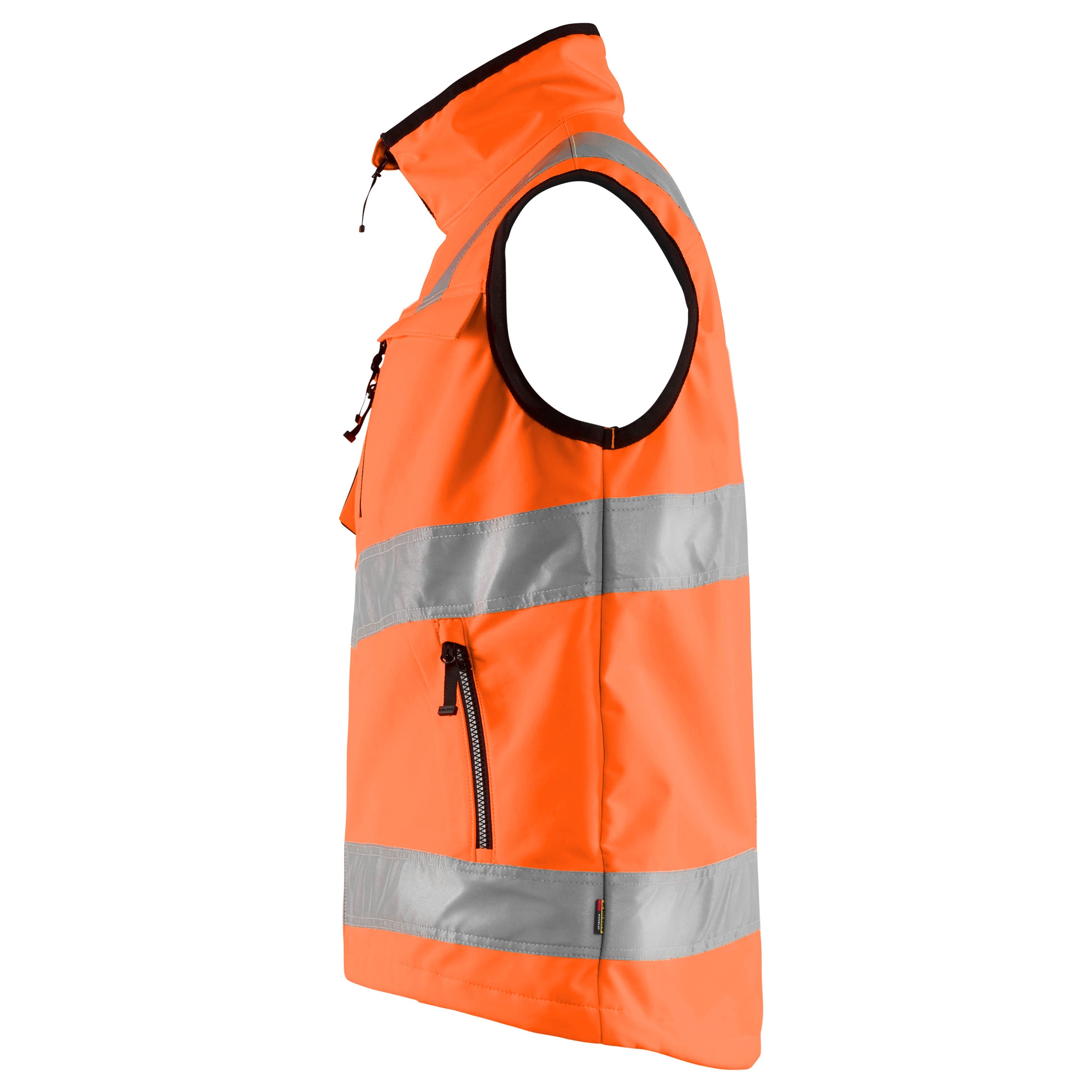 Modern Softshell vest in Hi-Vis colors with a waterproof and breathable fabric. The vest has a high collar and a soft fleece lining. Certified according to EN 20471 for improved visibility at work.