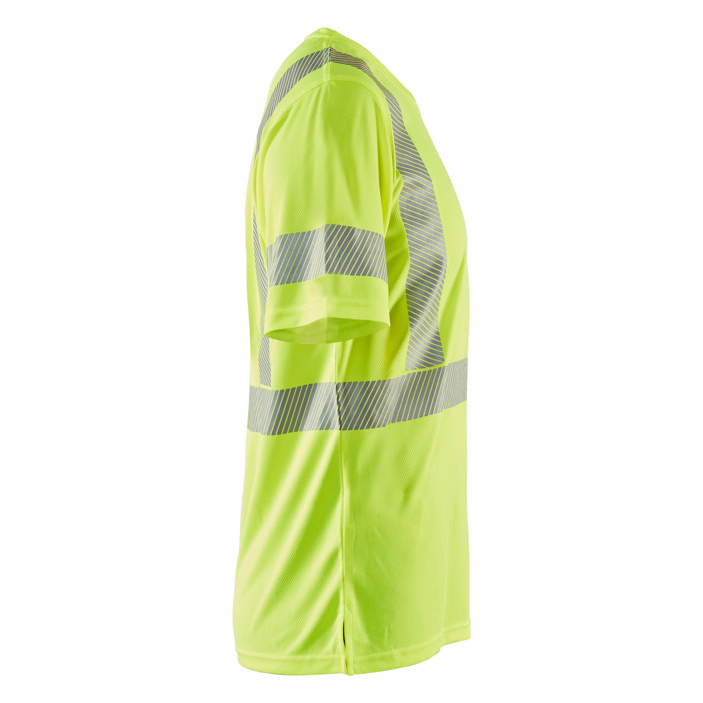 Hi-Vis t-shirt with UV protection made from light weight knitted fabric with structure for ventilation. Material has wicking properties for a comfortable and dry feeling against the body. The t-shirt has diagonal reflective tape stripes. Certified according to EN ISO 20471 class 2 and EN 13758-2 UPF 40+.