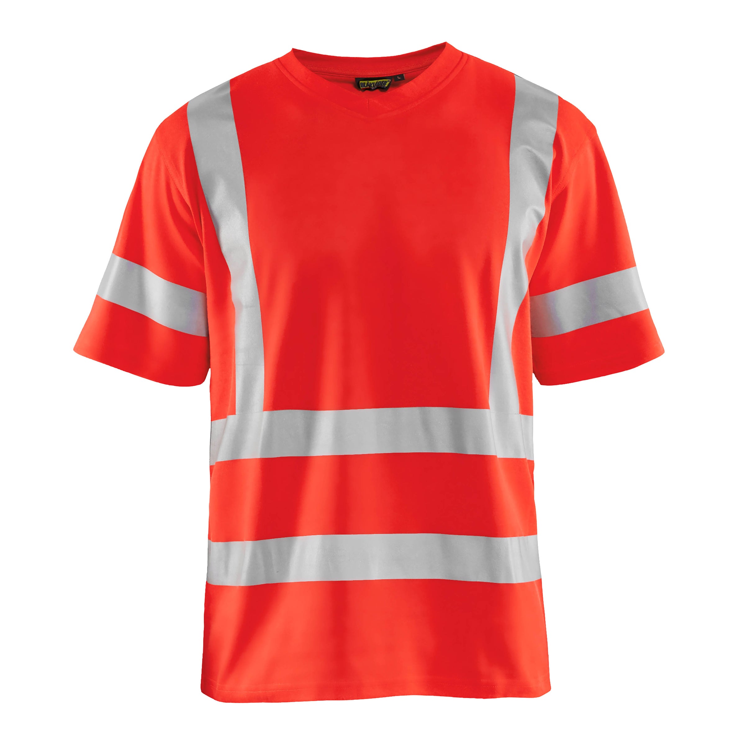 Short sleeve high visibility t-shirt with V-neck and stretchable reflectors in a new and comfortable material. The fabric has a cotton inside and a synthetic outside which provide a high comfort and eases to wash away odours. The t-shirt protects against UV-radiance 40+UPF. The t-shirt is certified according to high visibility and UV-protection.