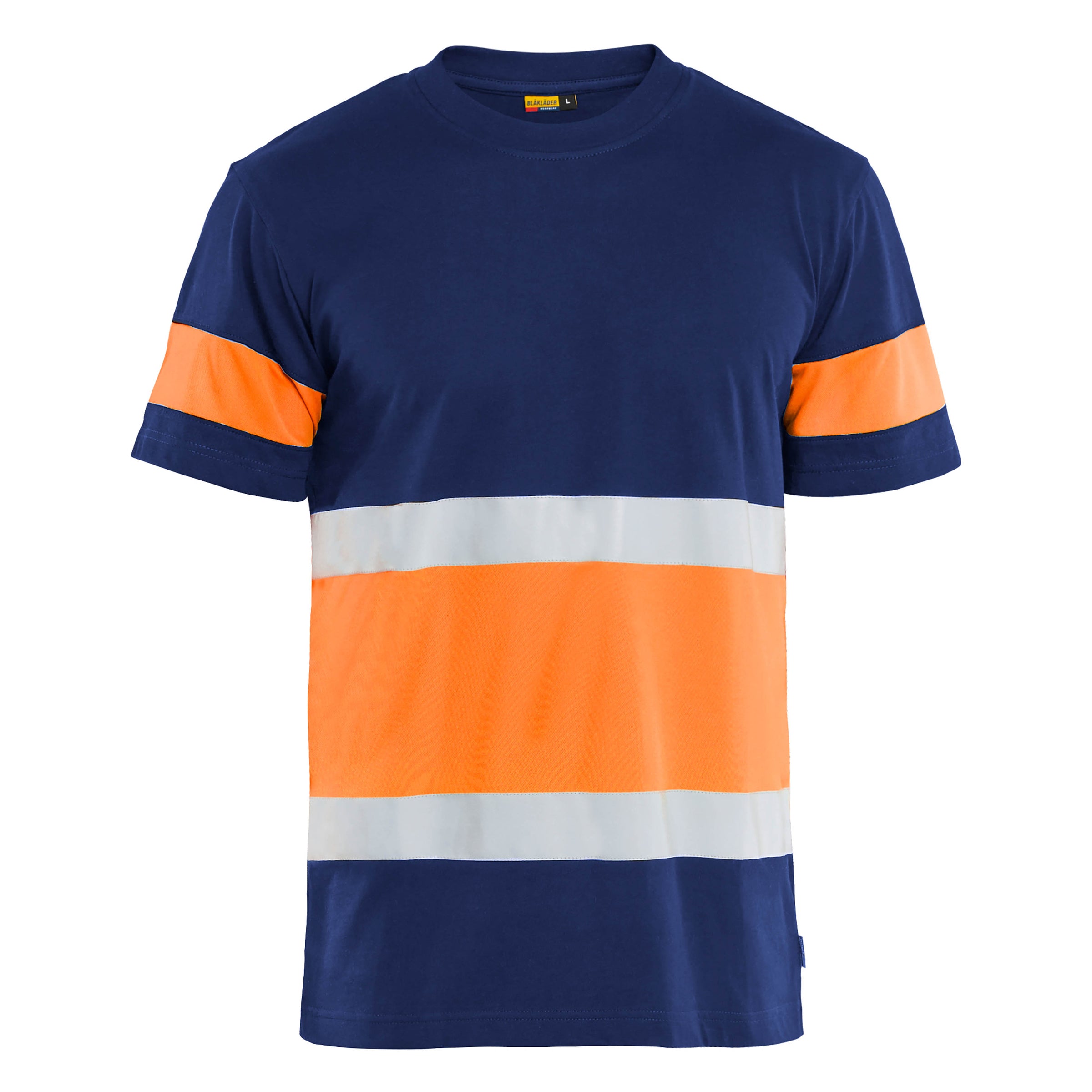 Soft and comfortable basic high visibility t-shirt with good value. The t-shirt has sewn on reflectors with open sides for better comfort and ability to move. Round neck with reinforced neck seam. The dark area of the sweater consists of 100% cotton and the high vis area of 100% polyester.