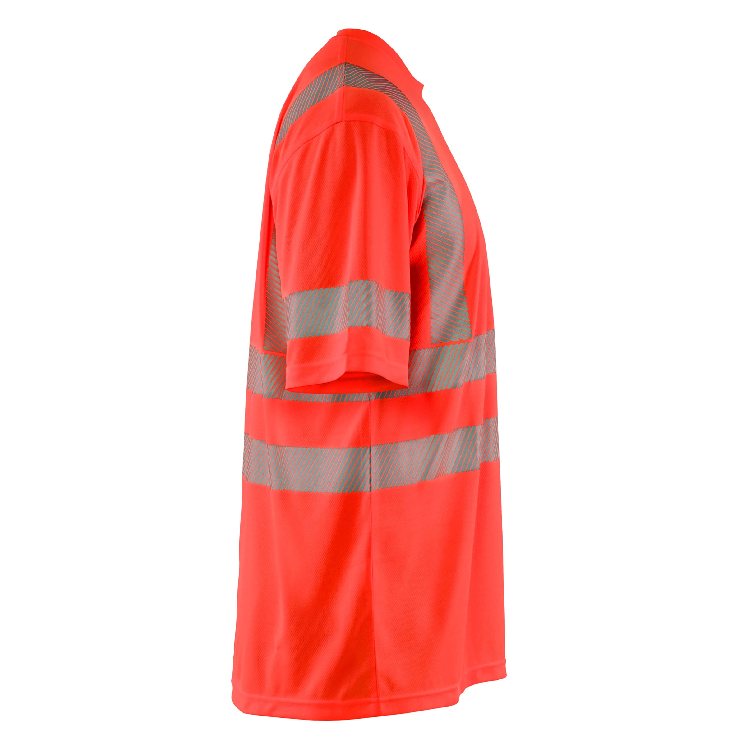 Round neck high visibility t-shirt made from light weight knitted fabric with structure for ventilation. Material has wicking properties for a comfortable and dry feeling against the body. Segmented reflective trim for good ventilation and stretch properties to allow superior ease of movement. UV protection 40+. Certified according to EN 13758-2 UPF 40+ and EN ISO 20471, XS-M Class 2, L-> Class 3.