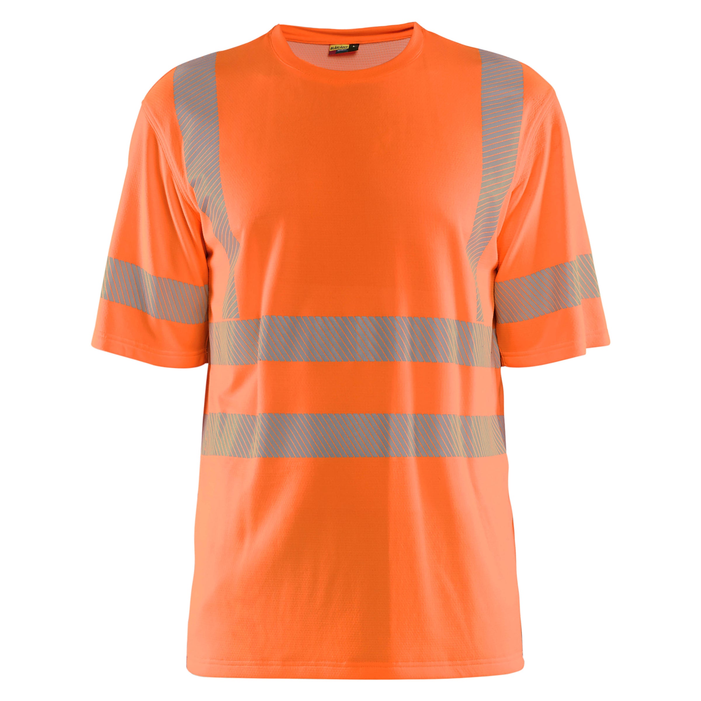 A Hi-vis t-shirt with segmented reflective tape for extra visibility. The material of the t-shirt has a great absorption capacity, which means that the sweat is transported out from the inside of the shirt and makes it settle on the outside. Once there, the material makes the moisture dry quickly and creates a comfortable climate for the body. It cannot be industrially washed. Wash at 60 degrees. It is certified according to EN ISO 20471, XS-M class 2, L-> class 3.
