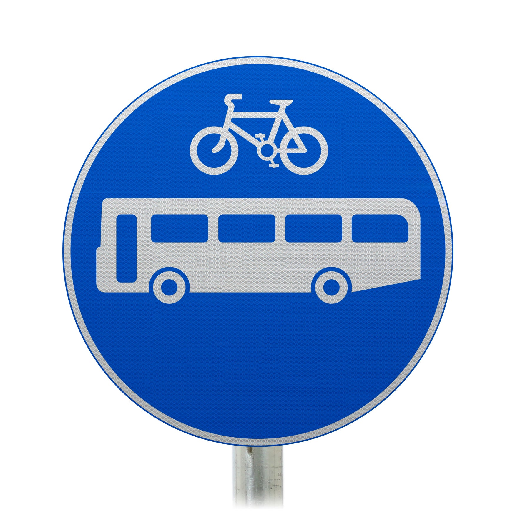 This sign has clear diagrams of a bicycle and a bus indicating clearly to road users the message stated. These clear white symbols are on a blue backing making it easier to see the symbols on it. To aid the visibility of this sign, it has an RA2 grade reflective material making it easy to see in dark conditions once light passes over it. The sign face is made from a composite material which has no scrap value making it less desirable to thieves.