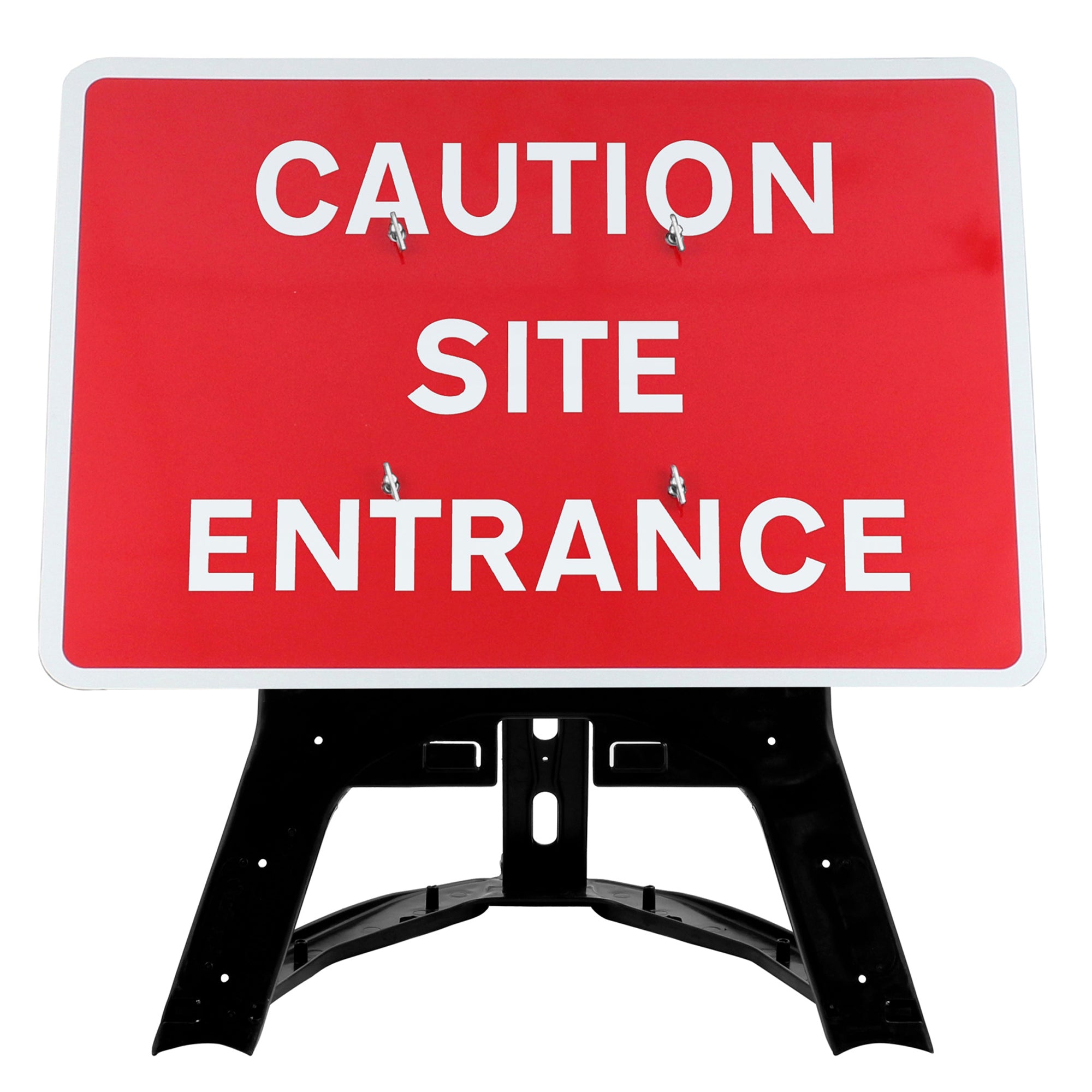 This Caution Site Entrance QuickFit EnduraSign like many other red and white temporary road signs serves as a warning. It informs and warns drivers that vehicles may suddenly slow down and begin to turn into a busy work site. Drivers being forewarned of this action can then take measures such as slowing to reduce risks and improve safety.