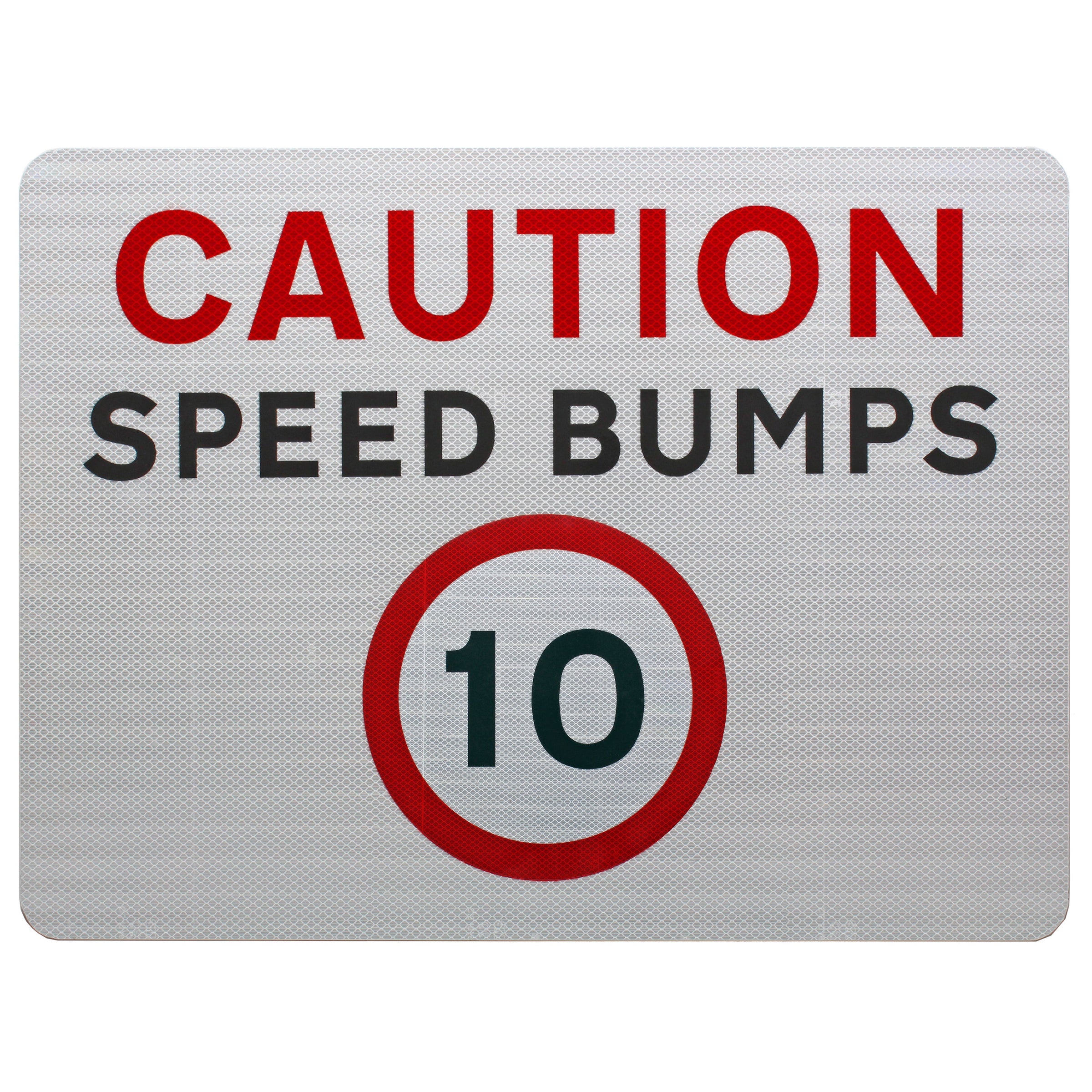 A 600x450mm sign with 'Caution Speed Bump 10mph' advisory. Printed on to high quality rigid 3mm composite, this won't fade or degrade in outdoor conditions. 10mph speed limits are generally advised for use with 50mm speed bumps.