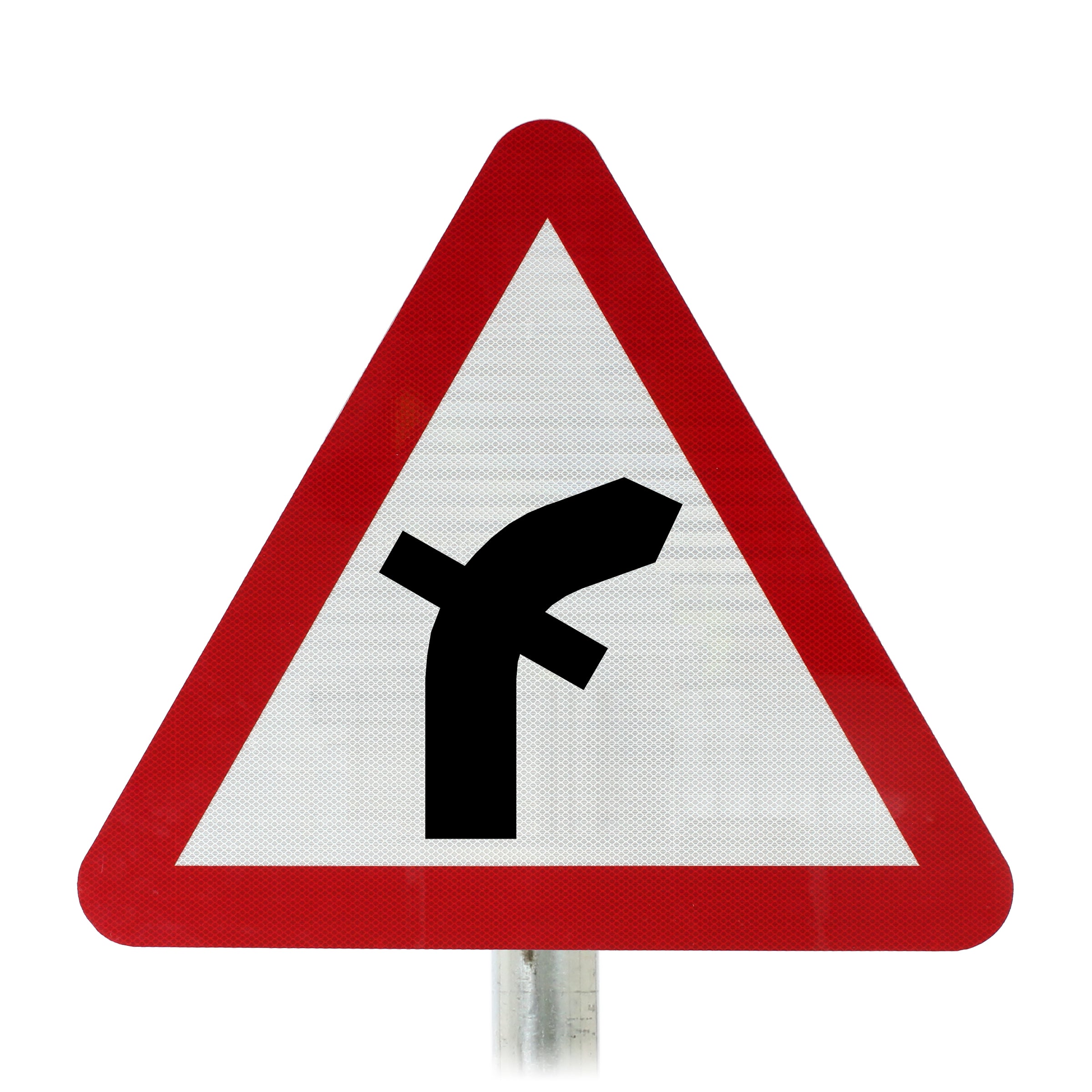 This is another version of the ‘Junction On A Bend Ahead’ sign. It shows the current road approaching a harsh bend with a lower priority road passing through the turning. These are often seen on A roads and are known by their diagram number 512.3.