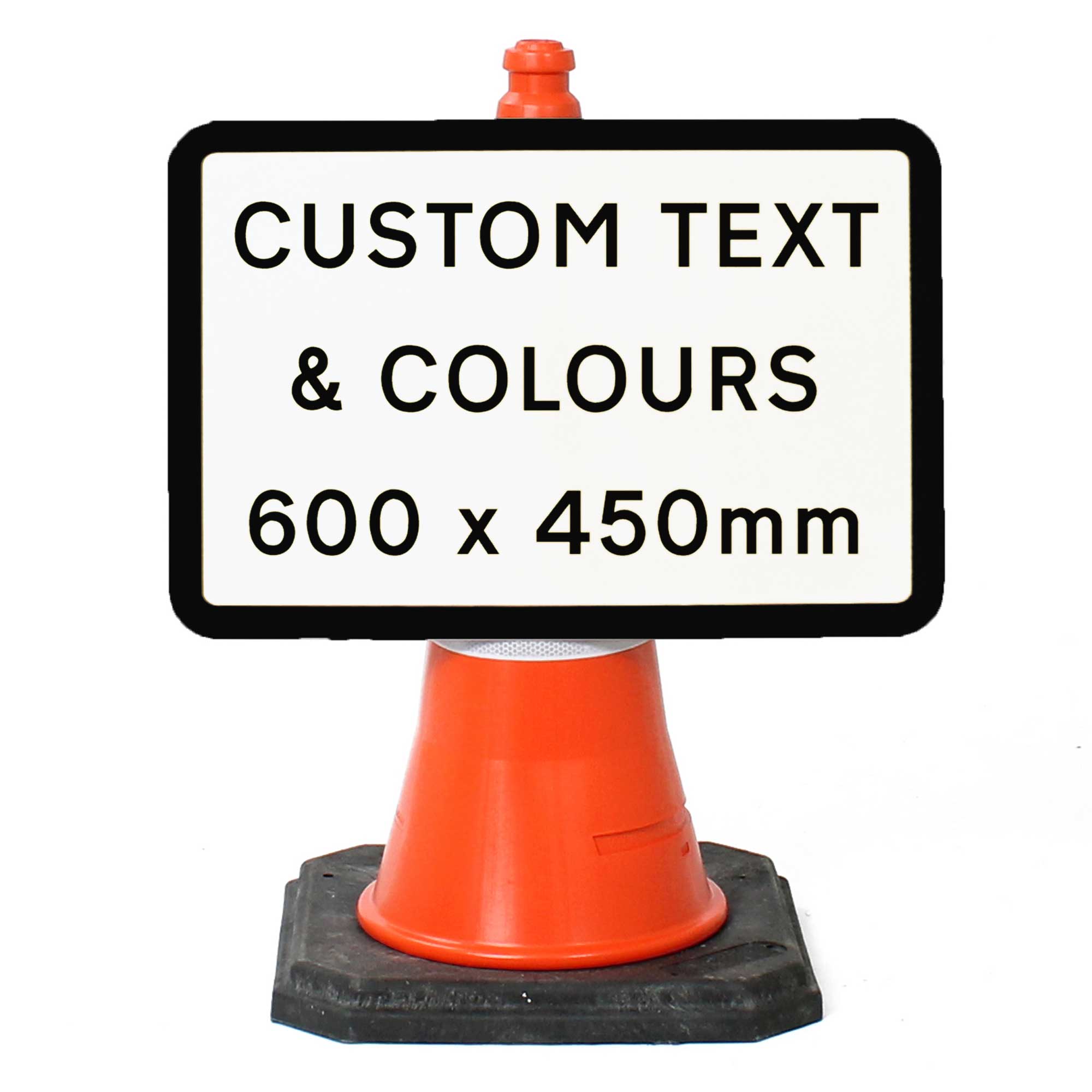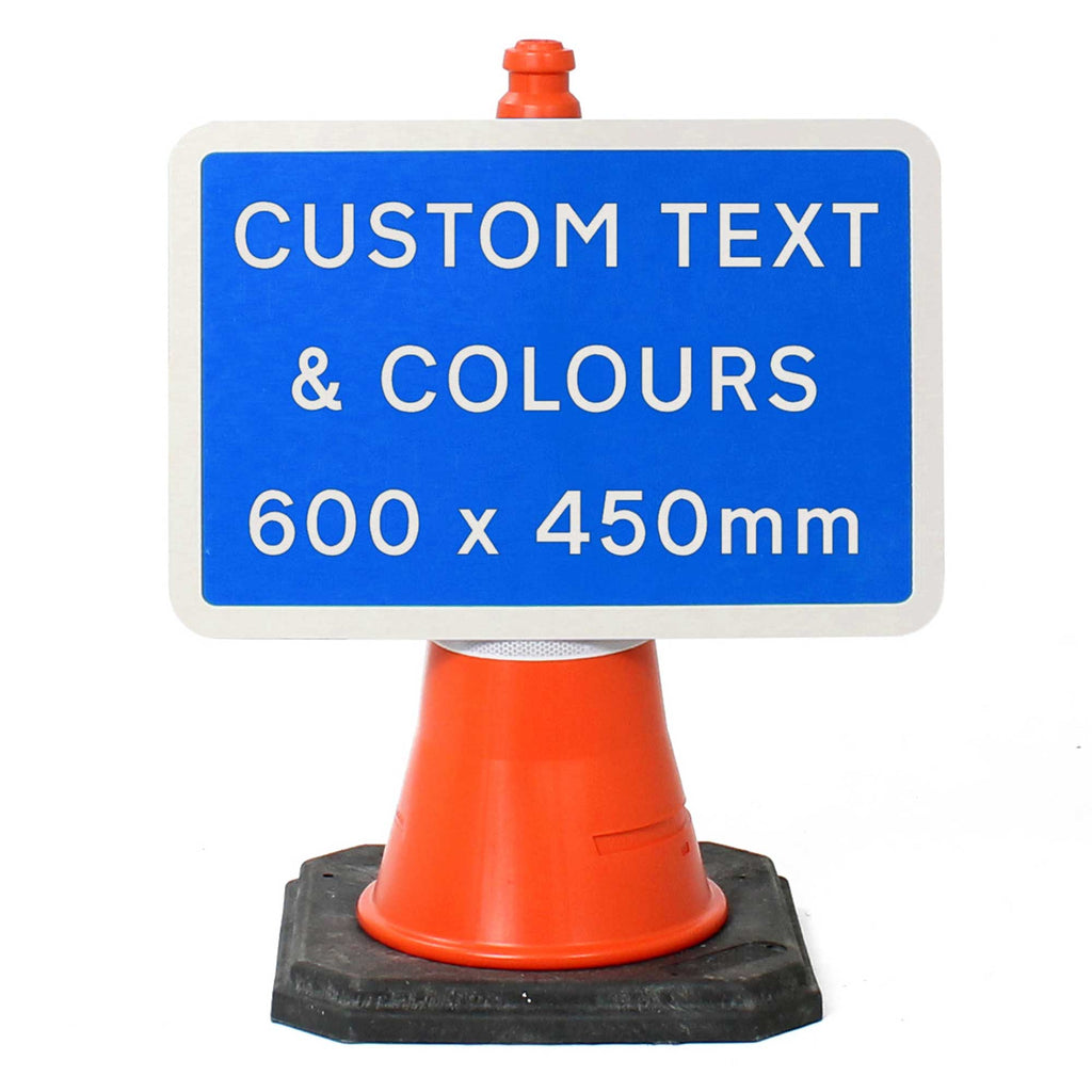 A customised cone sign face with dimensions 600x450mm, usually used during roadworks or events. This sign face is available in four colour combinations with any text of your choice. For this 600x450mm version, you will require a single cone to support the sign.