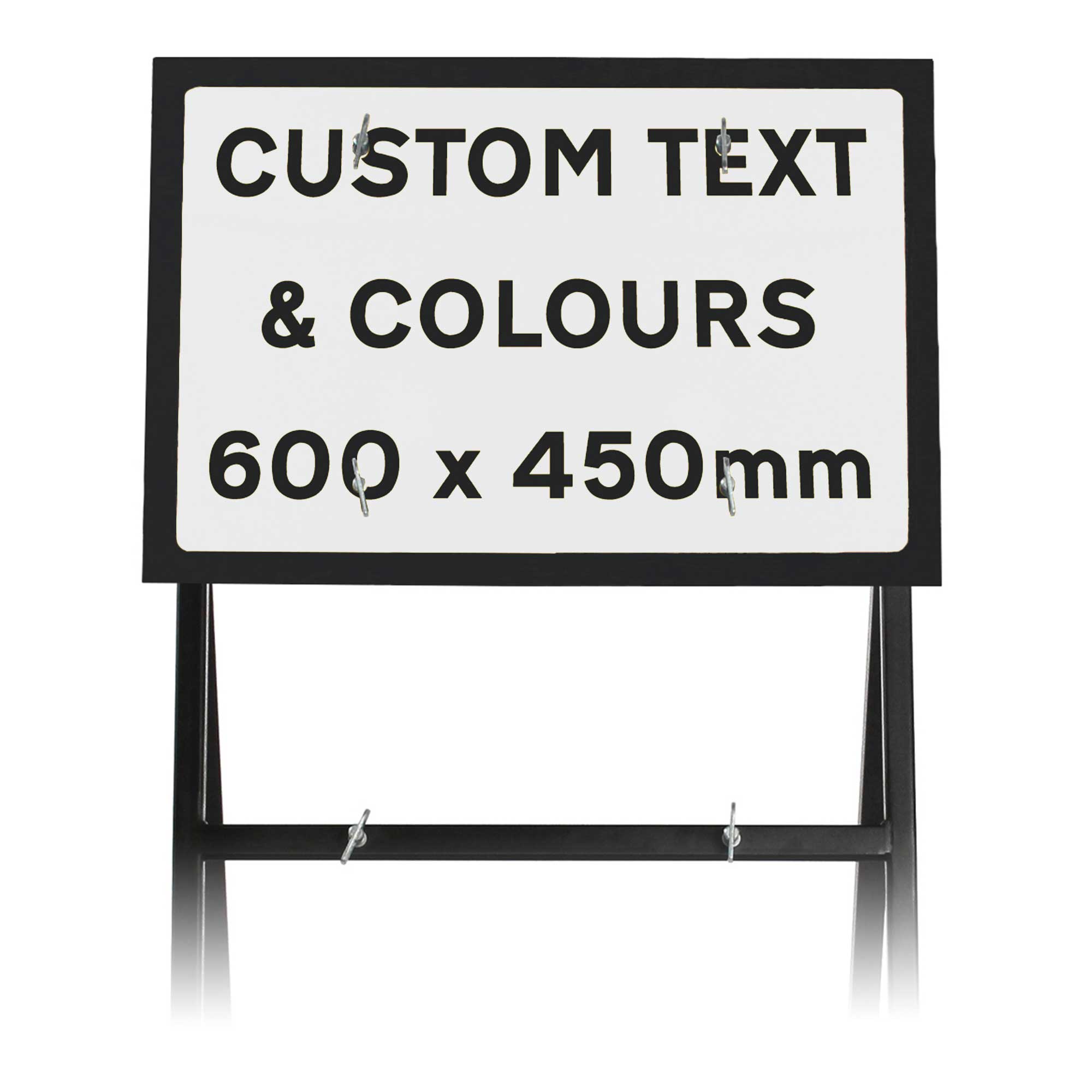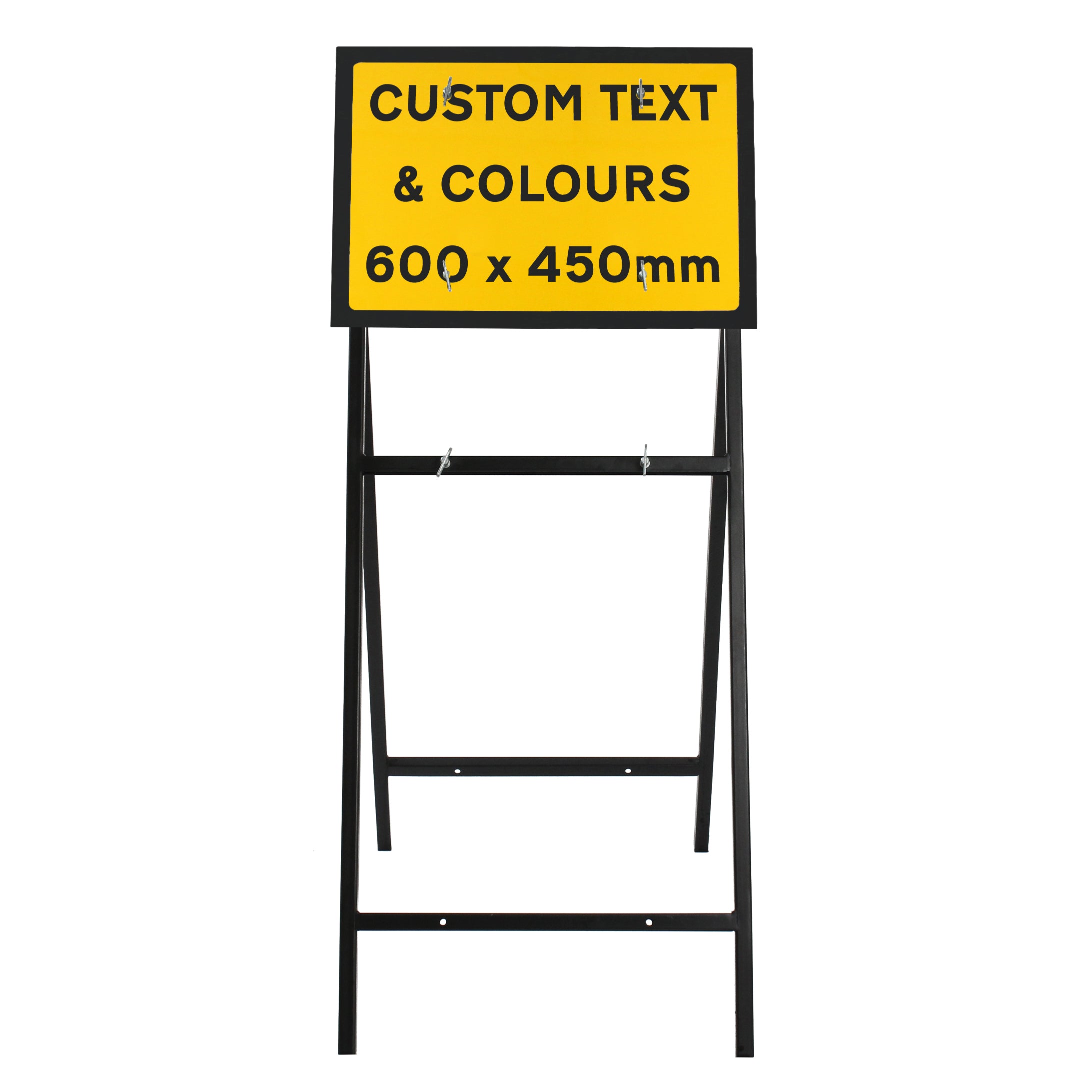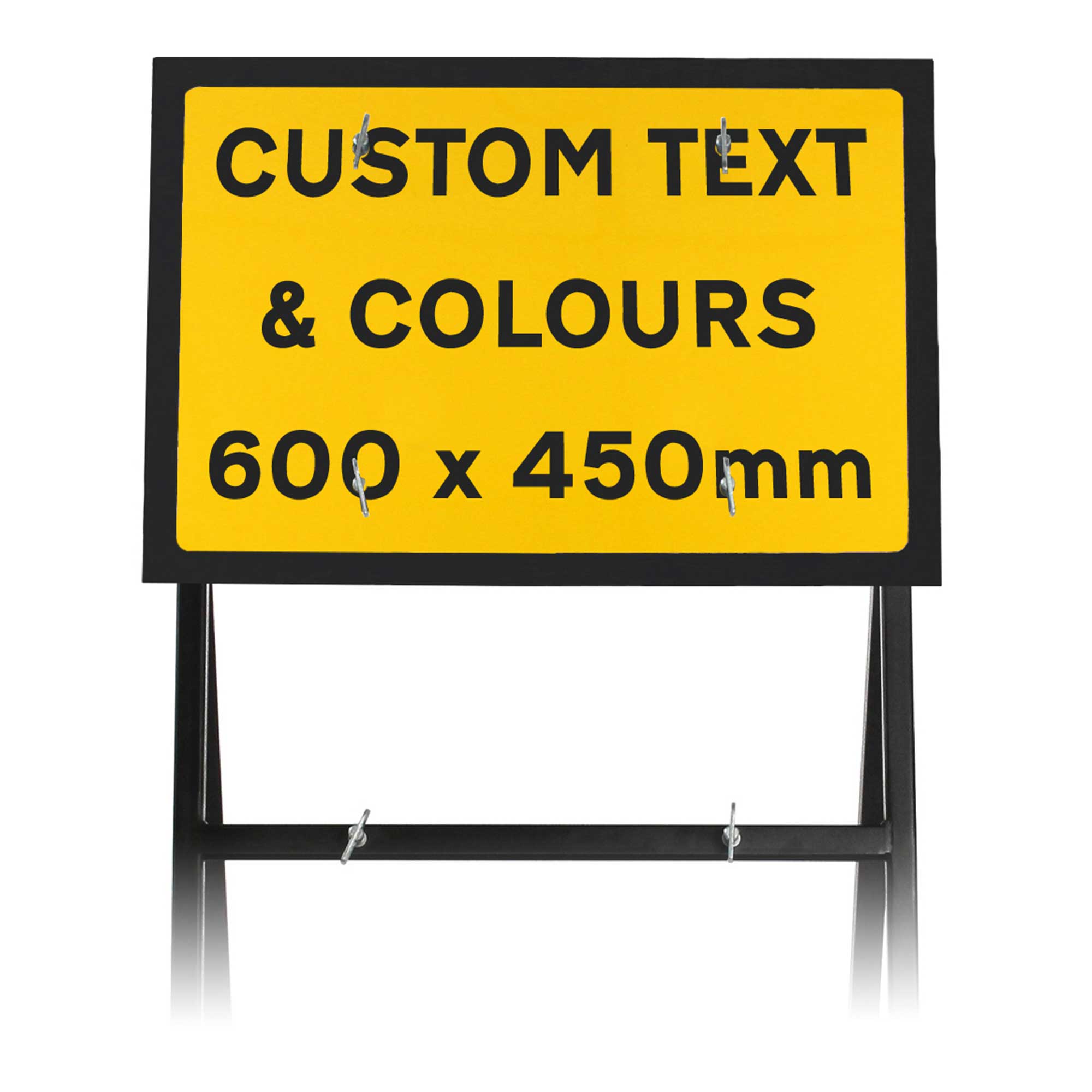 This custom coloured and worded 600x450mm quick fit sign face can be used to give information to pedestrians about road works, alternative routes and contact information. The smaller 600x450mm size of this sign makes it ideal for using in pedestrianised areas.