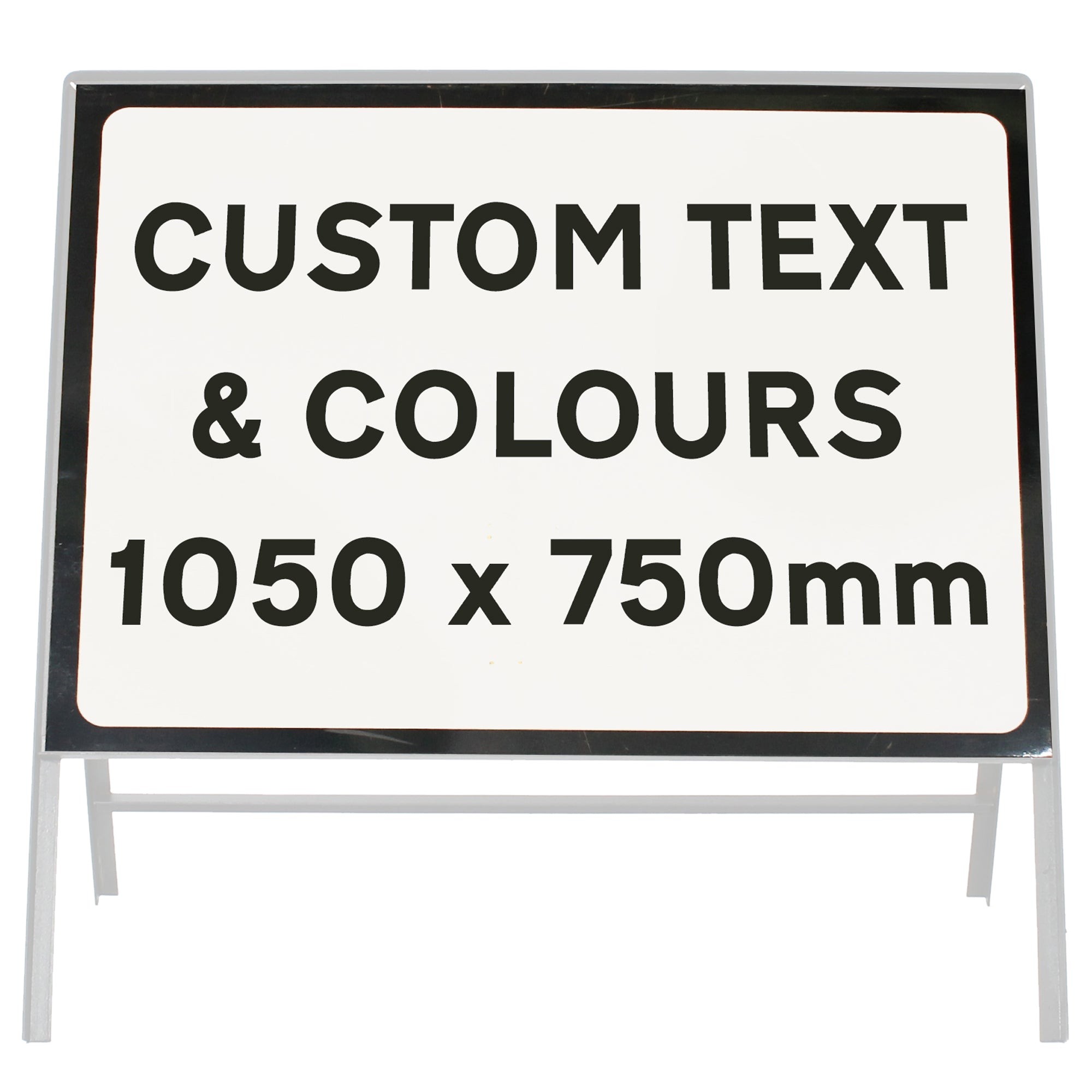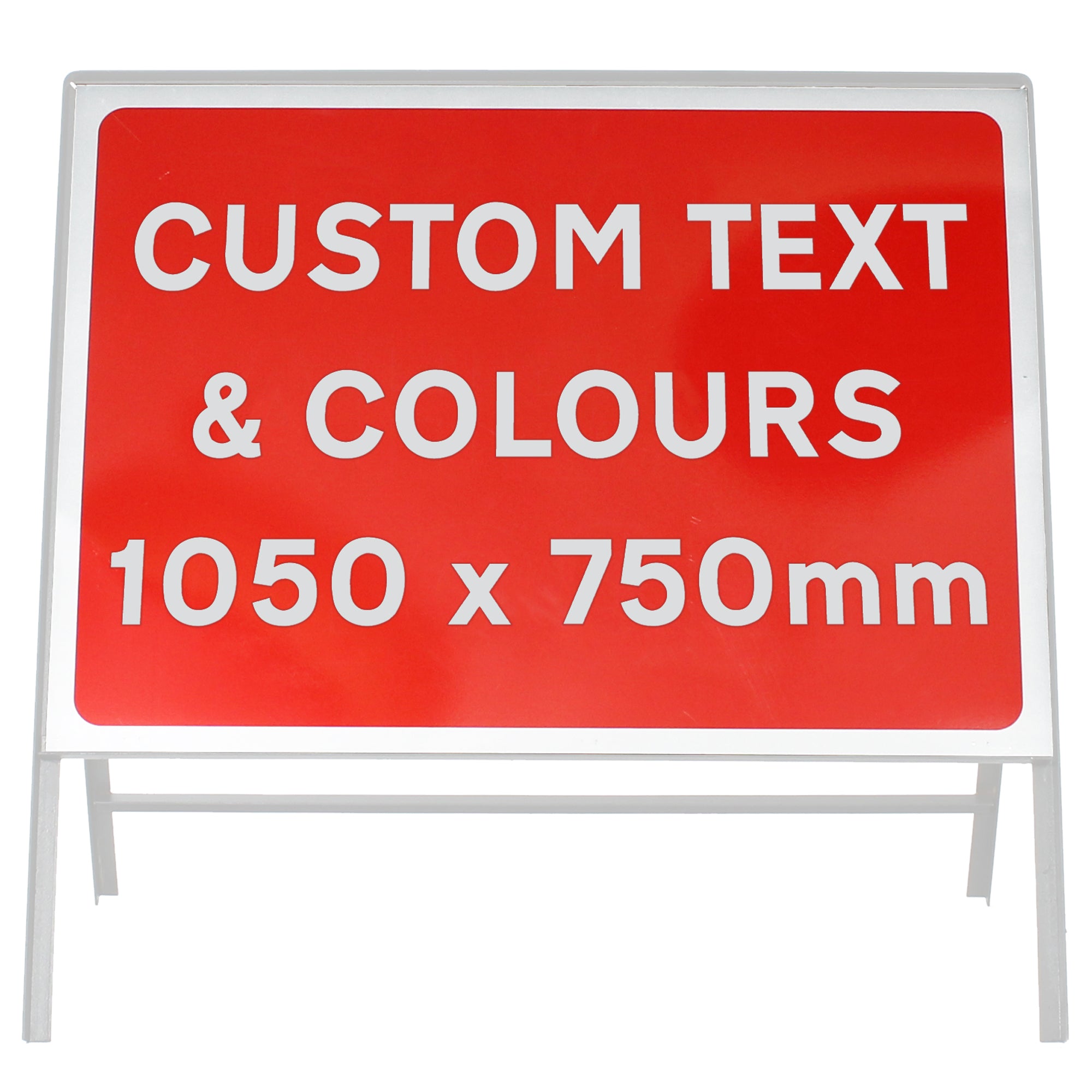 A customised metal sign face with dimensions 1050 x 750mm, usually used during roadworks or events. This sign face is available in four colour combinations with any text of your choice. These are optionally available with the frame and clips.