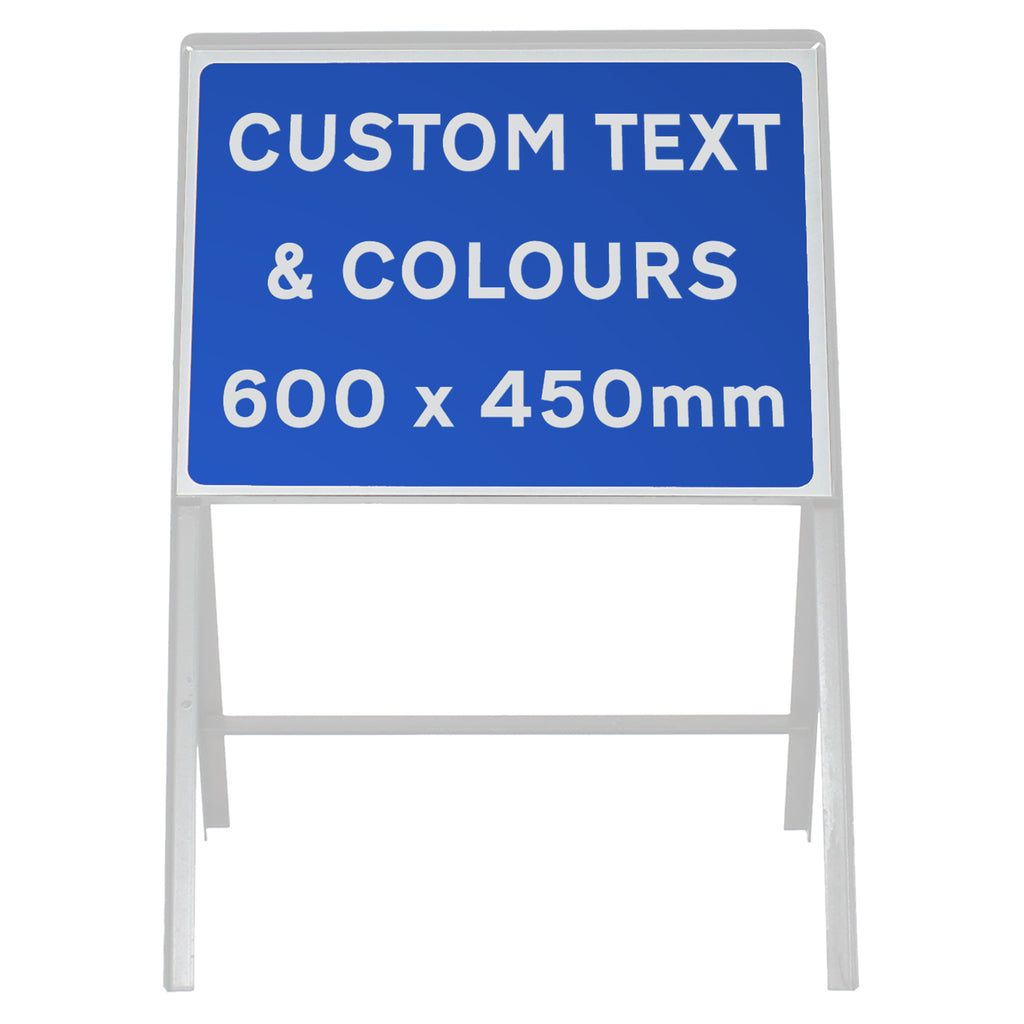 A customised metal sign face with dimensions 600 x 450mm, usually used during roadworks or events. This sign face is available in four colour combinations with any text of your choice. These are optionally available with the frame and clips.
