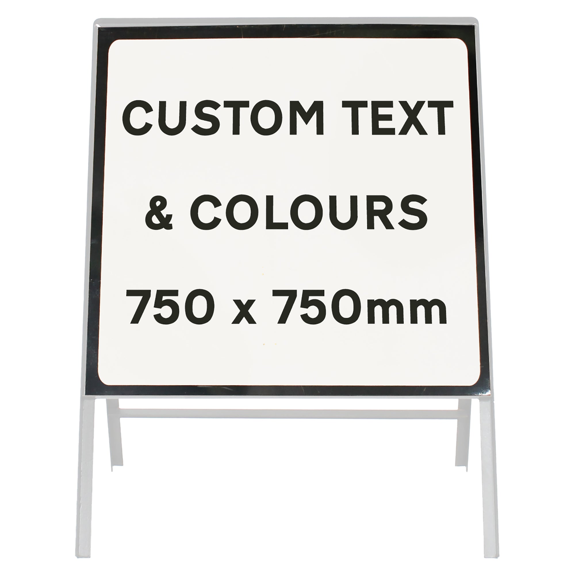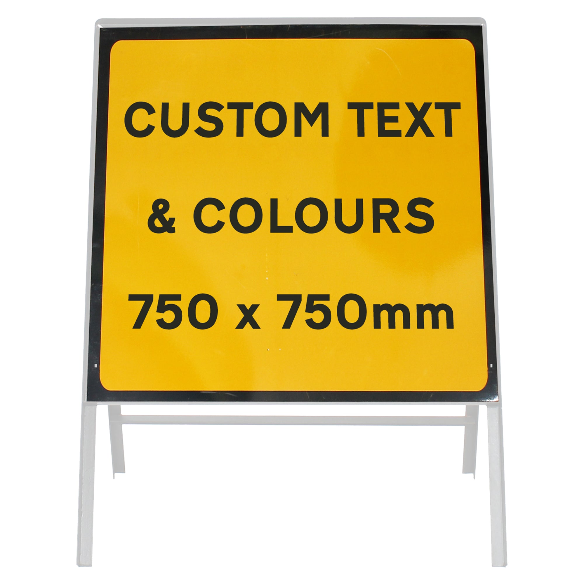 A customised metal sign face with dimensions 750 x 750mm, usually used during roadworks or events. This sign face is available in four colour combinations with any text of your choice. These are optionally available with the frame and clips.