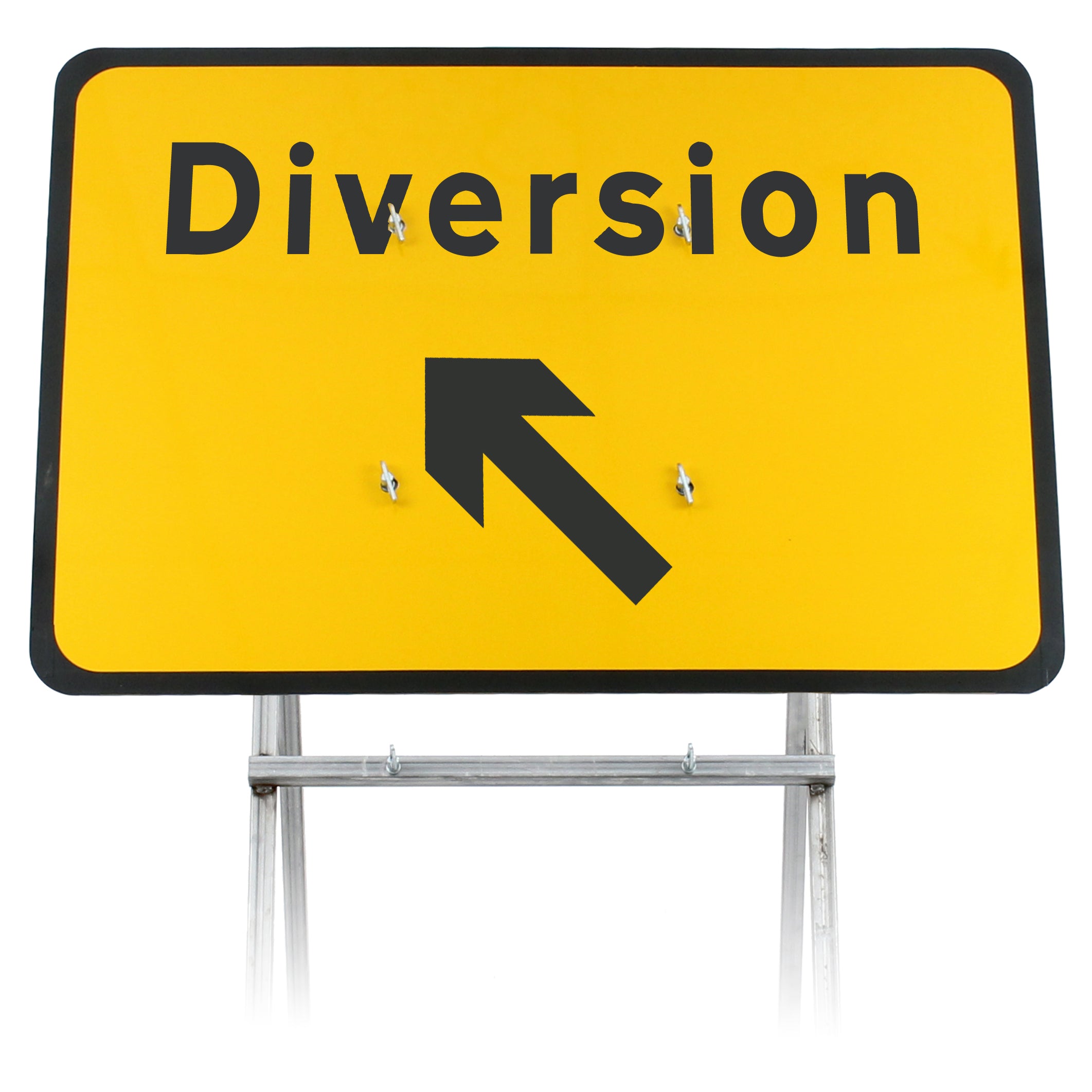 This Diversion arrow up left sign is used to signal that diverted traffic must follow the road on the diversion route which forks to the left ahead. When carrying out road works road closures are inevitable so having good clear diversion road signage is a must.