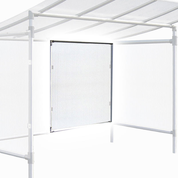 The rear cladding panel is made from the same cellular polycarbonate panels as the roof and sides. This can be used to clad an existing basic shelter or be added to an extension unit.