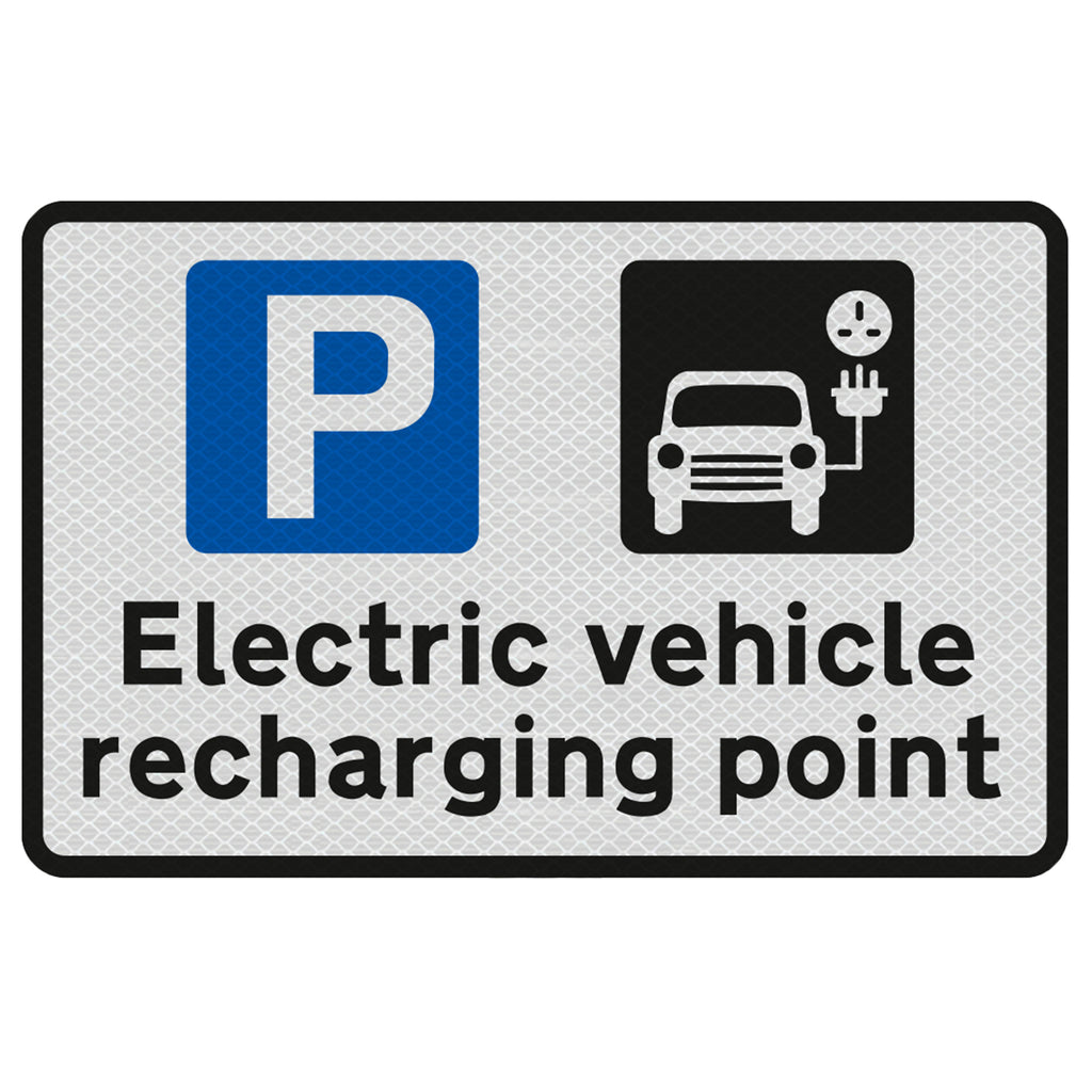 The sign includes the wording “Electric vehicle recharging point” and the two official parking and charging symbols. We recommend that you use these alongside charging bay markers for extra visibility.