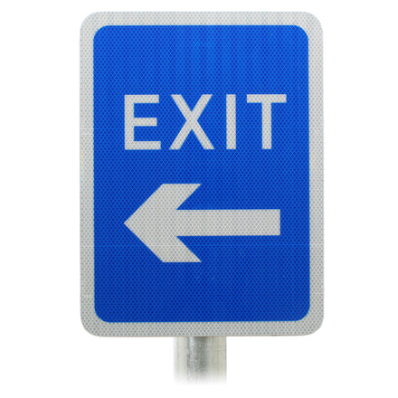 This post mounted exit sign includes an arrow underneath the word ‘exit’ to assist drivers in navigating their way out of car parks and other structures. White wording on a blue backing makes the sign easy to see and also fits in nicely with other car park signs and one-way signs.
