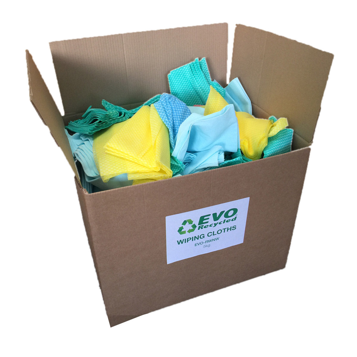 Evo Recycled® Non-Woven J cloth type material - 5kg Box. EVO spill products provide a unique solution for companies pursuing higher ethical and environmental standards without compromising performance and value. Each product in the range is manufactured from recycled or sustainable material. All EVO products are manufactured in Britain with a far smaller carbon footprint than the vast majority of Spill Control products produced overseas. EVO poly-wrap & box packaging recyclable.