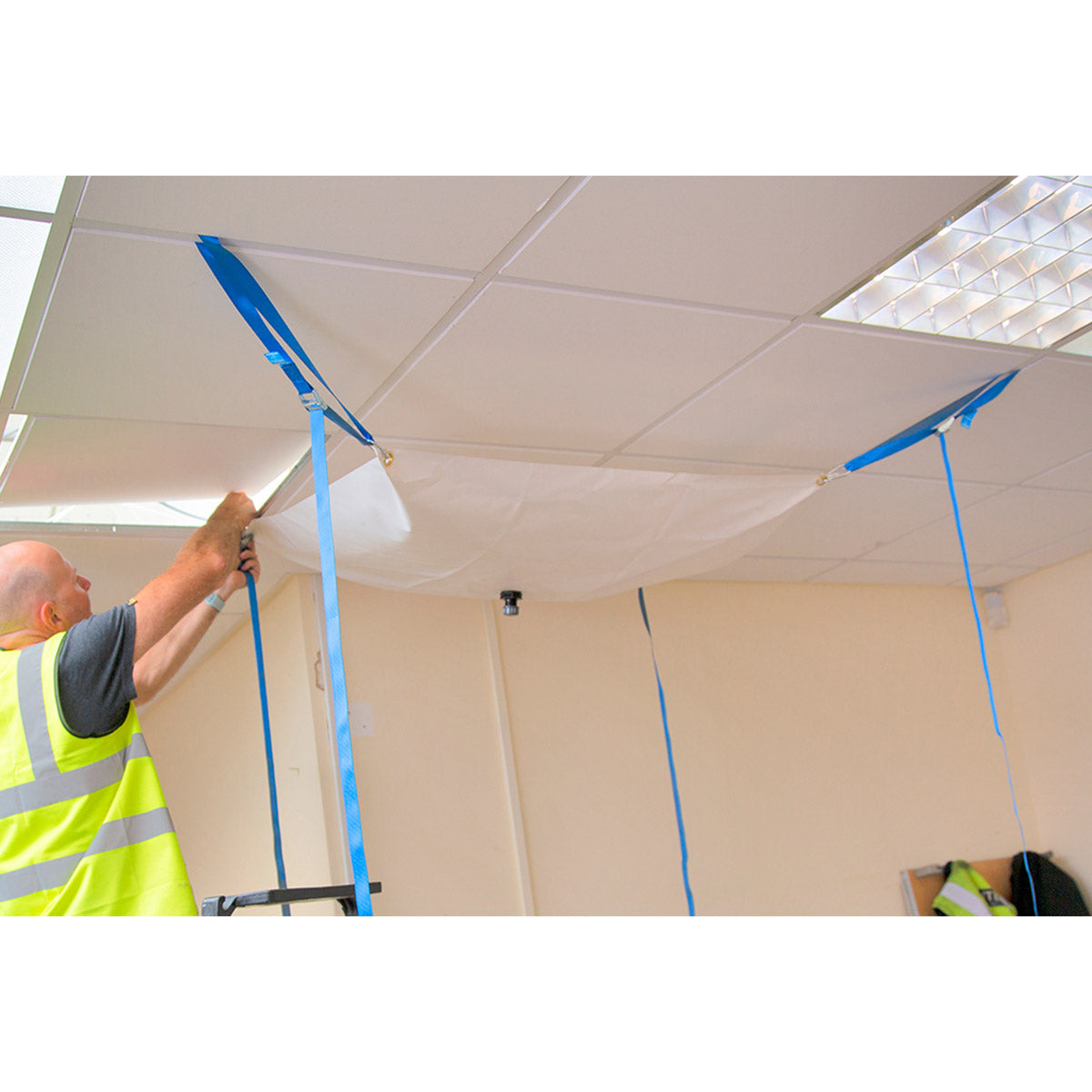 Leak Diverter Tarp & Fittings - Yellow or white Tarp (NO DRUM) The device hangs from the roof directly under drips and leaks and diverts water to a convenient collection point. The floor beneath stays dry, the risk of slips and falls is reduced whilst damage to goods and machinery is minimised. Provides a temporary solution until permanent repair can be made. Prevents damage to valuable stock and machinery. Keeps water off the floor to avoid accidental slips and falls. Reduces necessity to relocate goods and personnel. TARP AND FITTINGS: · Heavy-duty waterproof fabric with eyelets at 50cm intervals and a central drainage point · 5 metre hose and hose fittings · Takes standard UK Hozelock fittings · Adjustable hanging straps