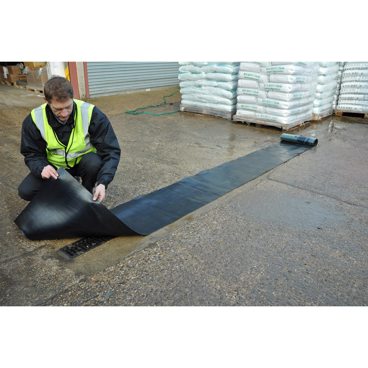 Neoprene drain gully. Prevents spills entering drain systems. Lays flat on ground to divert spills away from drain. Resistant to chemicals. Easily washed for repeated use. Overlap 10cm at edges for optimum performance.