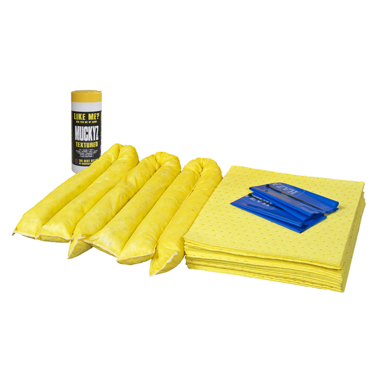 Refill for Spill Kit in Shoulder Bag. For use on leaks and spills in the workplace for quick and efficient clean-up, helping to minimise environmental impact. Fast acting absorbent socks and pads. Helps protect the environment from potential pollution. Ideal for vehicles and plant and machinery cabs. Assists compliance with EA/SEPA/NIEA guidelines (PPG26). Disposal bag and zip-tie included for responsible waste disposal. Comes complete with one full tub of 50 Muckyz® Textured Wipes
