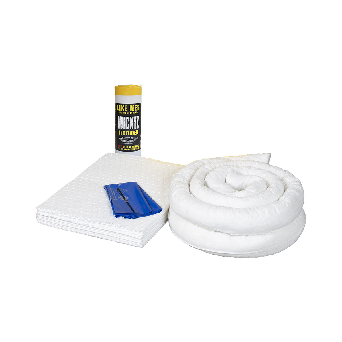 For responsible disposal, a disposal bag and zip-tie are included, and instructions for use are clearly displayed on the interior label. The kit also comes complete with one full tub of 50 Muckyz® Textured Wipes, suitable for Oil & Fuel clean-up.