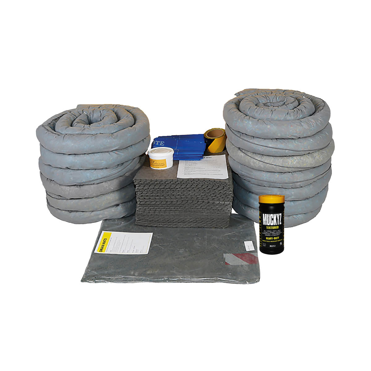 - Pack Contents: Contents: 13 x Absorbent socks 8cm x 3m 100 x Absorbent pads 39cm x 48cm 1 x Plug Rug drain cover 40cm x 40cm 1 x 0.5kg Plugging compound 5 x Disposal bag & tie 1 x Roll Spill Hazard tape 1 x Tub of 100 Muckyz® Textured Wipes (ESW-100) 1 x Instruction and contents sheet