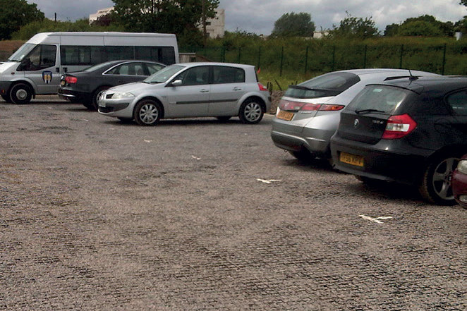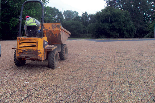 The base was madeup of hardcore and crushed stone, then compacted and levelled with a roller. The laying course was made up of a finer stone which was levelled ready for the grids to be laid down. Once the grids had been laid it was back filled with MOT Type 1.