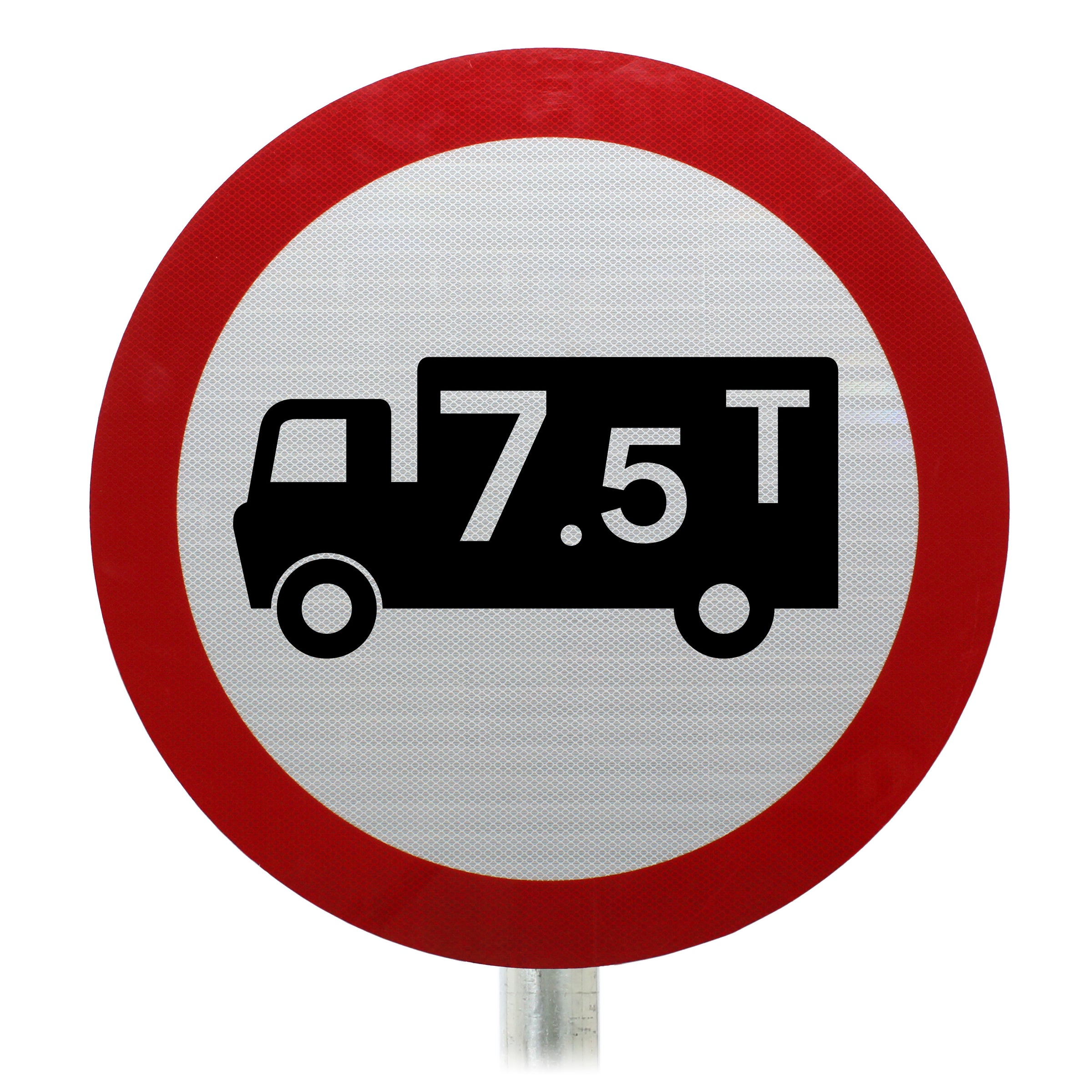This common permanent sign features a goods vehicle with a weight printed on the side. The most commonly seen variant of this sign features a limit of 7.5t. Other weight restrictions can be used. Please enter the weight restriction value required in the options box above.