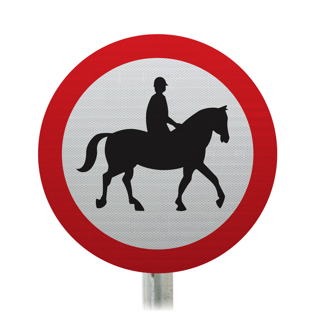 You are likely to see this sign where horse riders sometimes ride on a route intended for cycles and pedestrians only. This could cause a hazard by getting in the way or startling the horse in a confined area. The sign can be used on its own, without a supplementary plate, if the restriction is for all times or can be used with a supplementary plate to display a time period or exceptions to the rule.