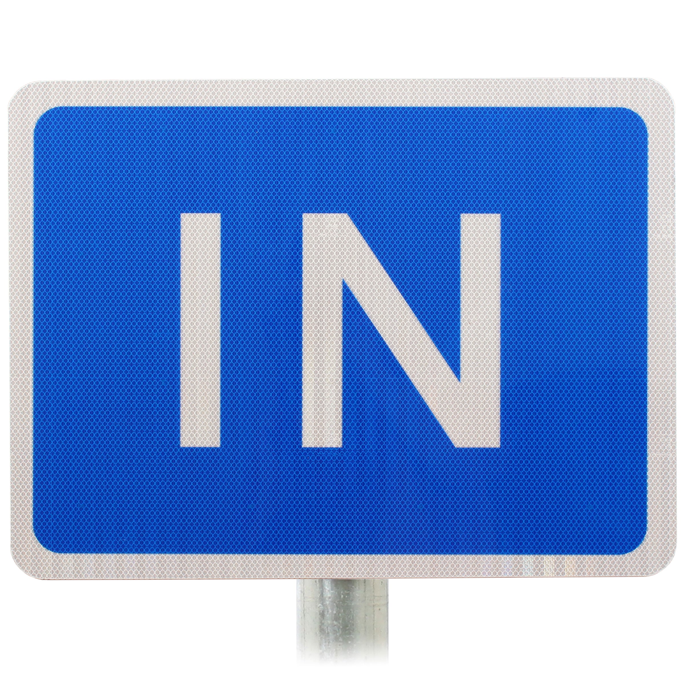 This ‘in’ sign is used on properties and premises with more than one entrance. This post mounted sign should be used to indicate which route should be used for entering.