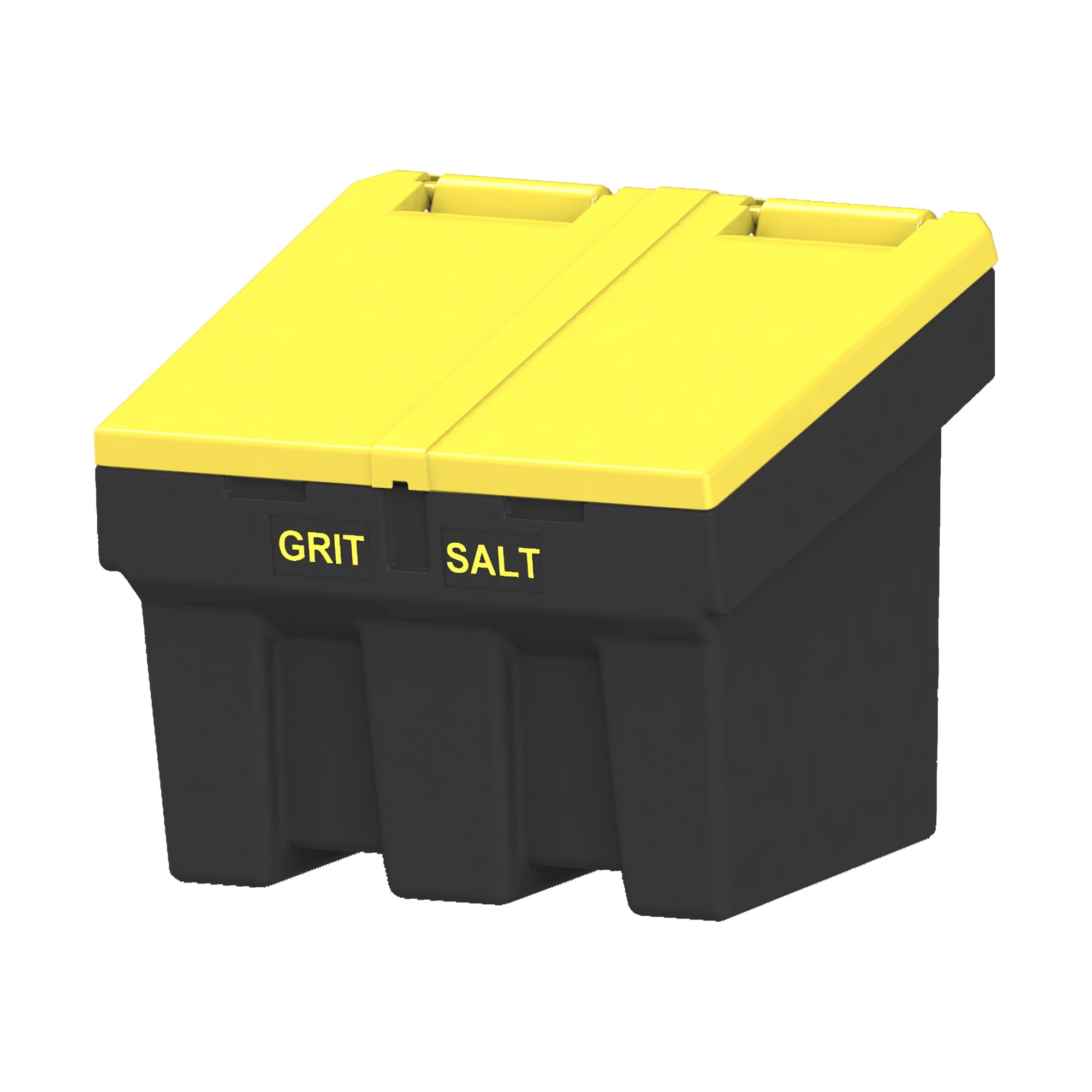 The bin features forklift slots to make it easier to move around site when filled to the brim with rock salt and finger grips on the lid, making it easier to lift should it ever freeze shut.