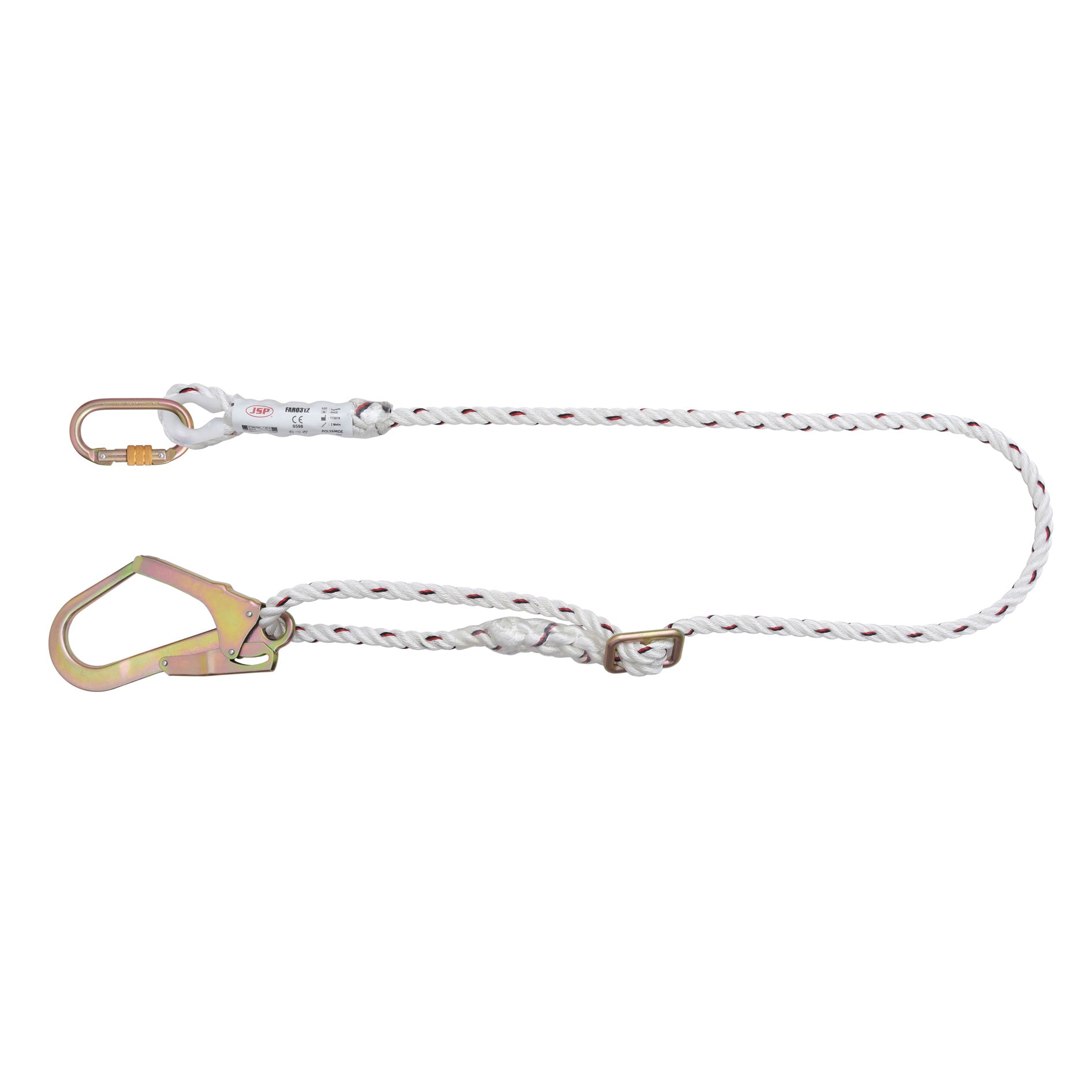 The rope of this lanyard is manufactured from a quality 14mm 3-strand twisted rope with black and red wear tracers within. The non-adjusting end of the lanyard features a wear-resistant thimble that reinforces the connection between the rope and screw gate connector.