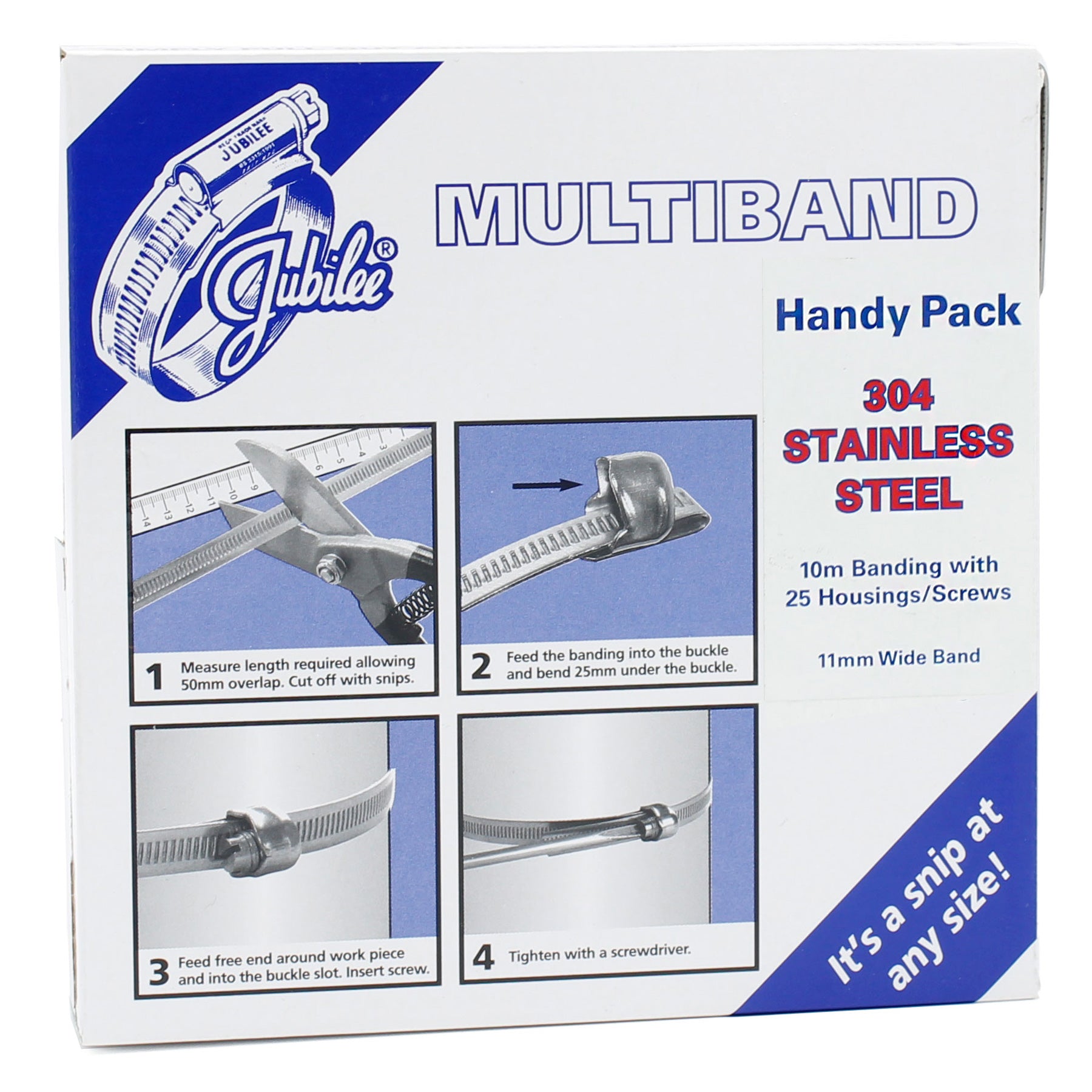 This stainless steel multiband starter kit comes in two sizes: the “pocket pack”, which contains a 3m roll of banding and eight screw housings, and the “handy pack”, which includes 10m of banding and twenty-five screw housings. These are also available as mild steel multiband starter kits in case you do not need stainless steel.