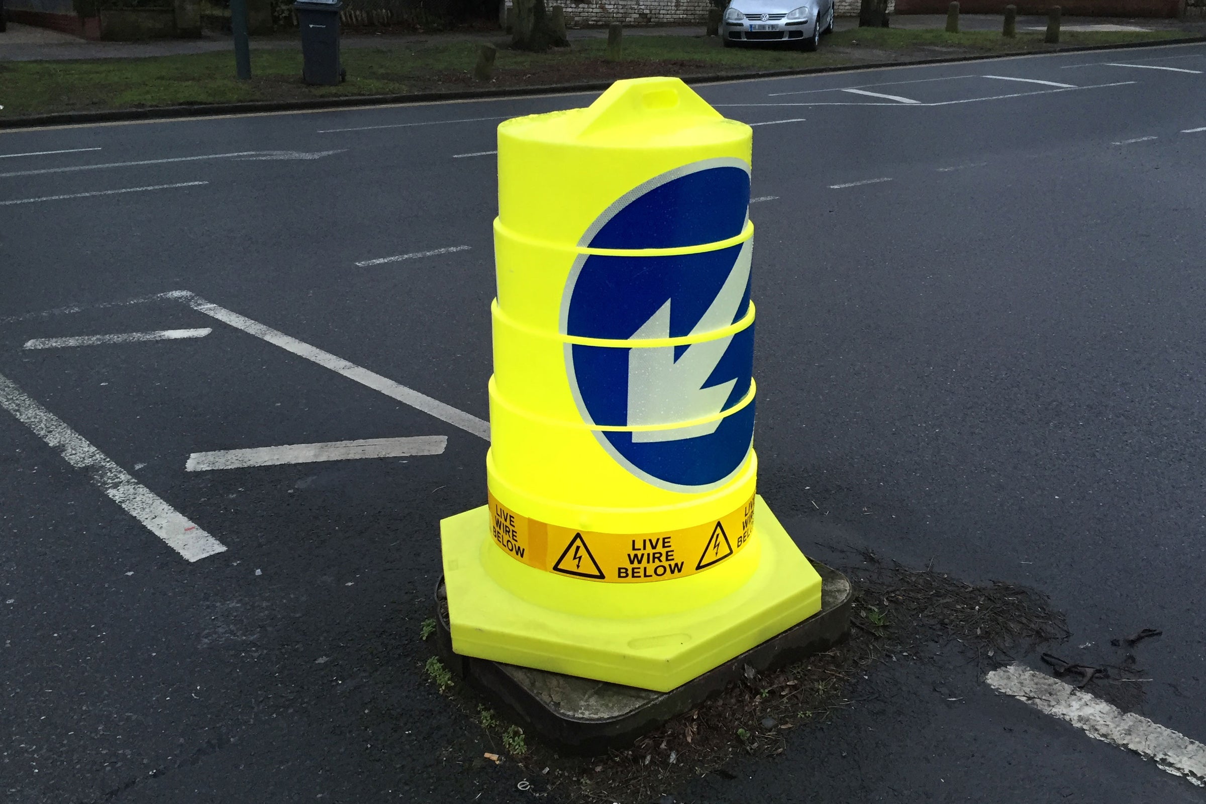 Usually called 'jumbo cable covers' , this product is often used to cover live electrical openings when illuminated traffic bollards have been damaged or are missing.
