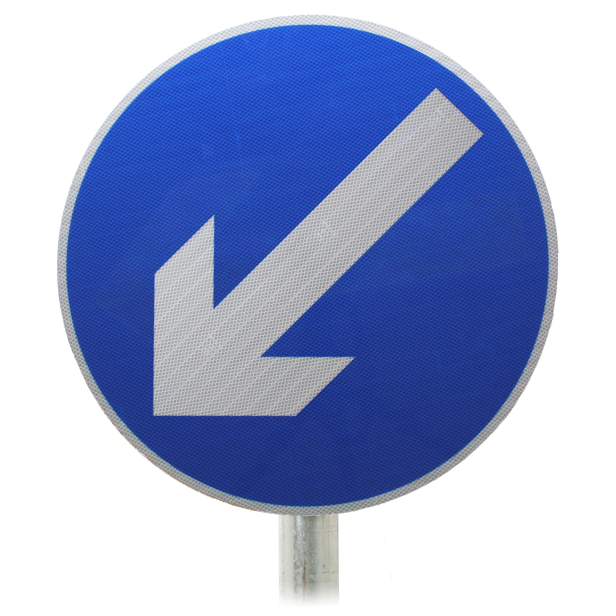 This post mounted keep left road sign is mentioned in the TSRGD guidelines as diagram 610. It is used to inform traffic that traffic must pass the sign on the side indicated. There are several common sites where these keep left signs are used, these include the exits of roundabouts and on traffic islands and junctions. This sign can be used with a 608 sign when used on a dual carriageway.