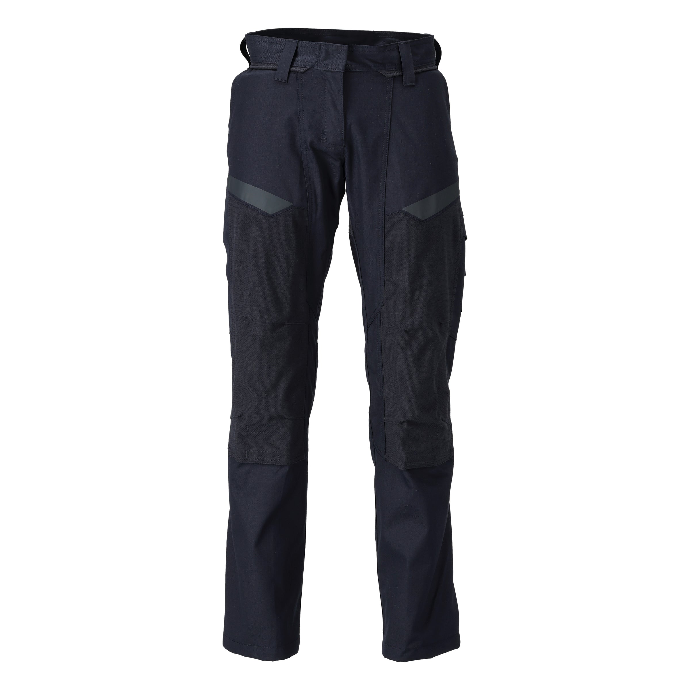 Ladies fit DIAMOND. Anti-static, acid-protective and flame retardent. Protects from electric arcs. Stretch fabric on parts of the product. Prepared for holster pockets with Click Pocket System. Double stitched seams on the leg and crotch. Ergonomically formed trouser leg. Belt loops. Hidden stud fastening. Fly with zip. Front pockets. Back pockets with reinforcement and flaps. Ruler pocket with flap and Kevlar® reinforcement. Thigh pocket with phone pocket and flap with hidden press stud and integrated ID card holder. Detachable ID card holder. Adjustable kneepad pockets with CORDURA fabric. The trousers can easily be folded down. Leg lengths 70 and 76 can be extended by 3 cm, leg length 82 can be extended by 5 cm. With print effects.