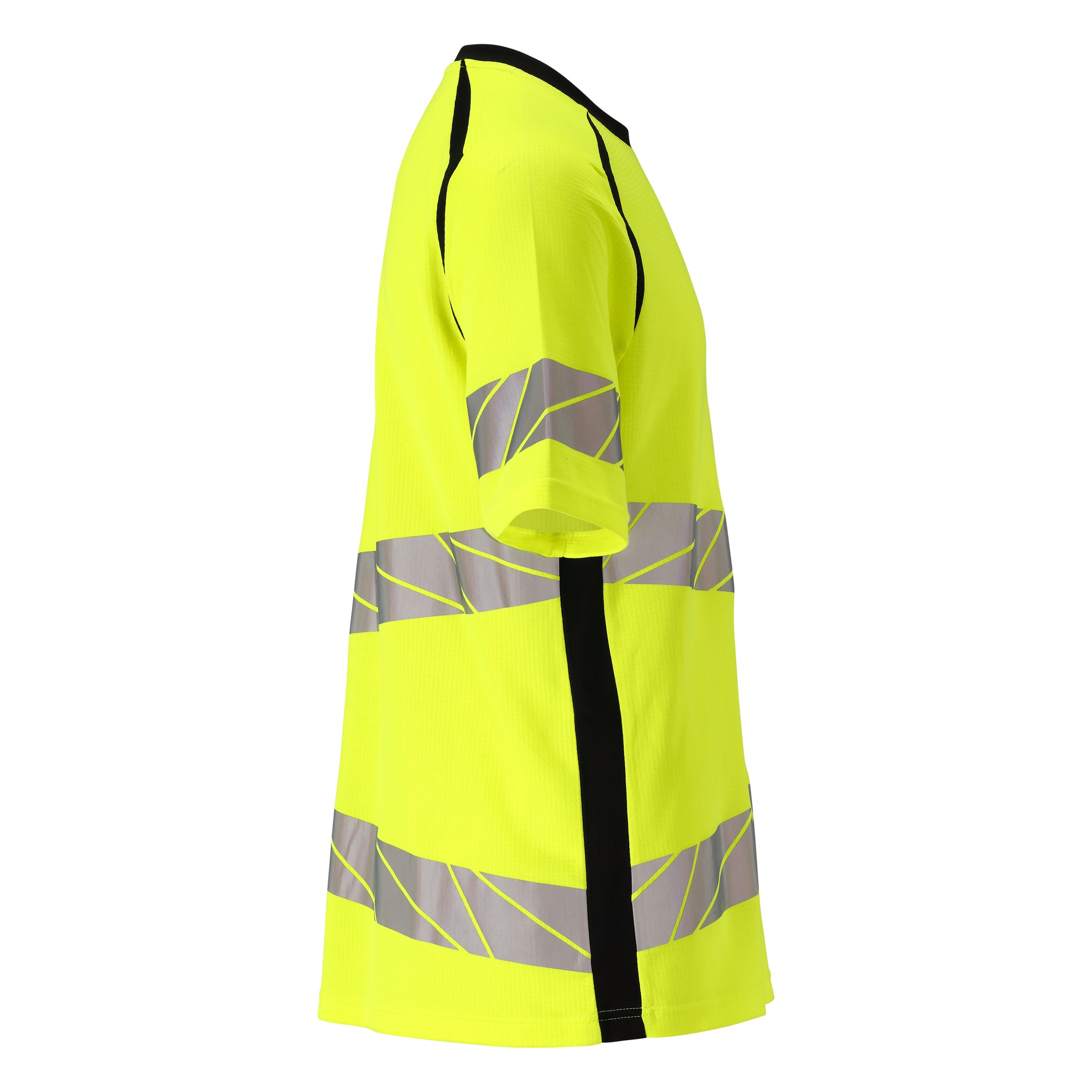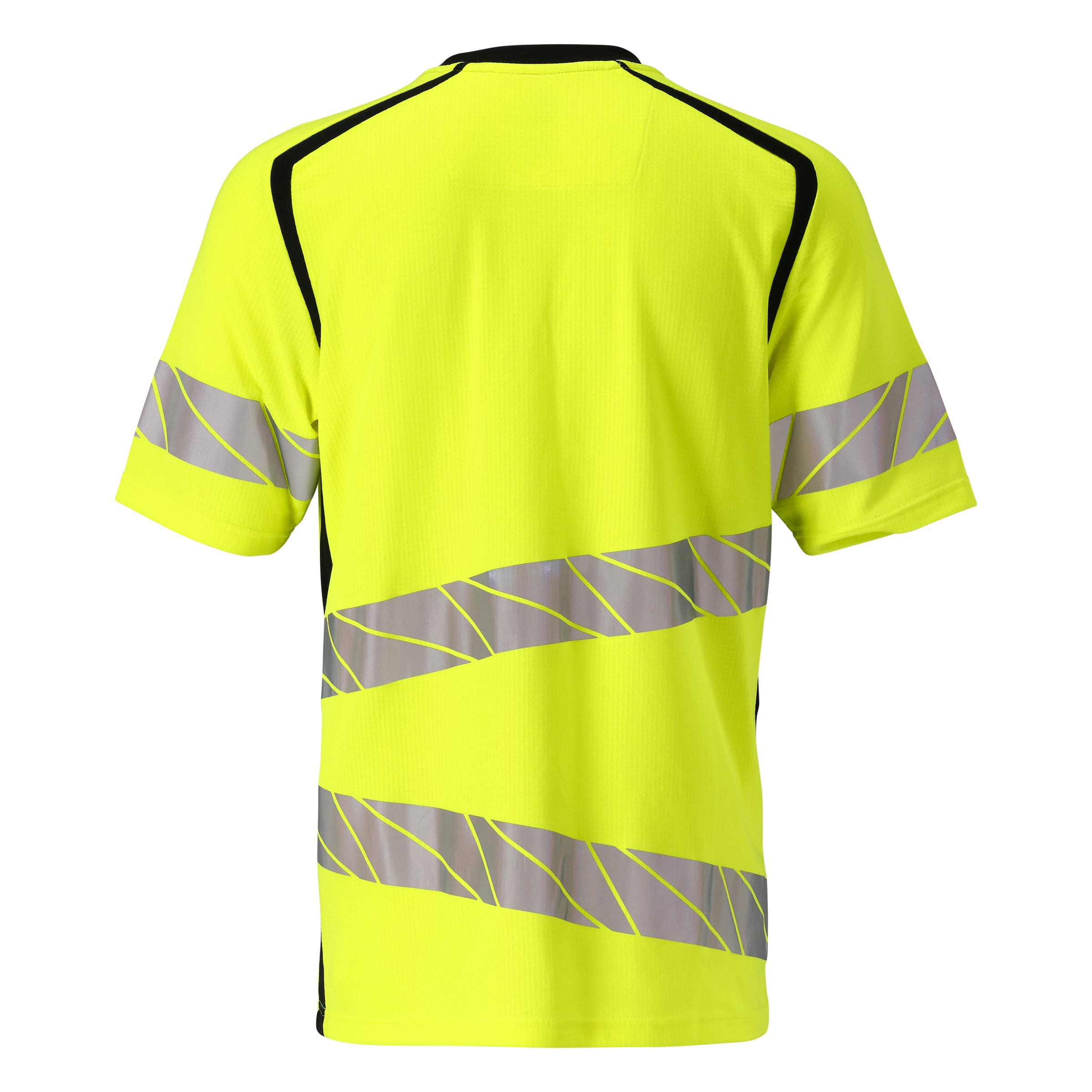 Premium. Fluorescent with oblique, transverse reflective strips. Two-toned. Modern fit. Comfortable cotton on the inside and durable stretch polyester on the outside. Square jacquard pattern. Elastic reflective strips. Round neck. Rib at neck. Neckband.