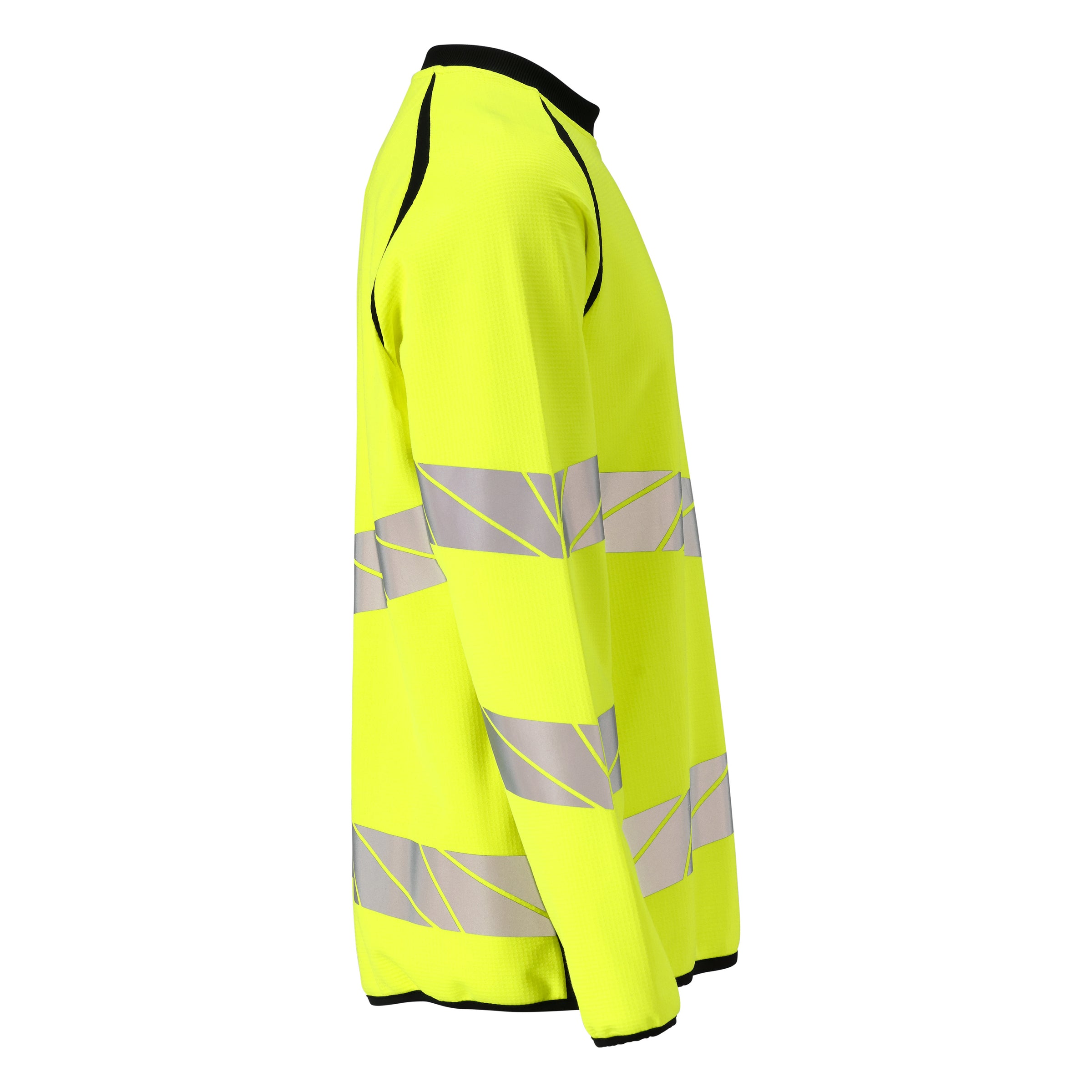 Premium. Fluorescent with oblique, transverse reflective strips. Two-toned. Modern fit. Comfortable cotton on the inside and durable stretch polyester on the outside. Square jacquard pattern. Elastic reflective strips. Round neck. Rib at neck. Internal neck yoke. Neckband. Elastic band at cuffs and waist.