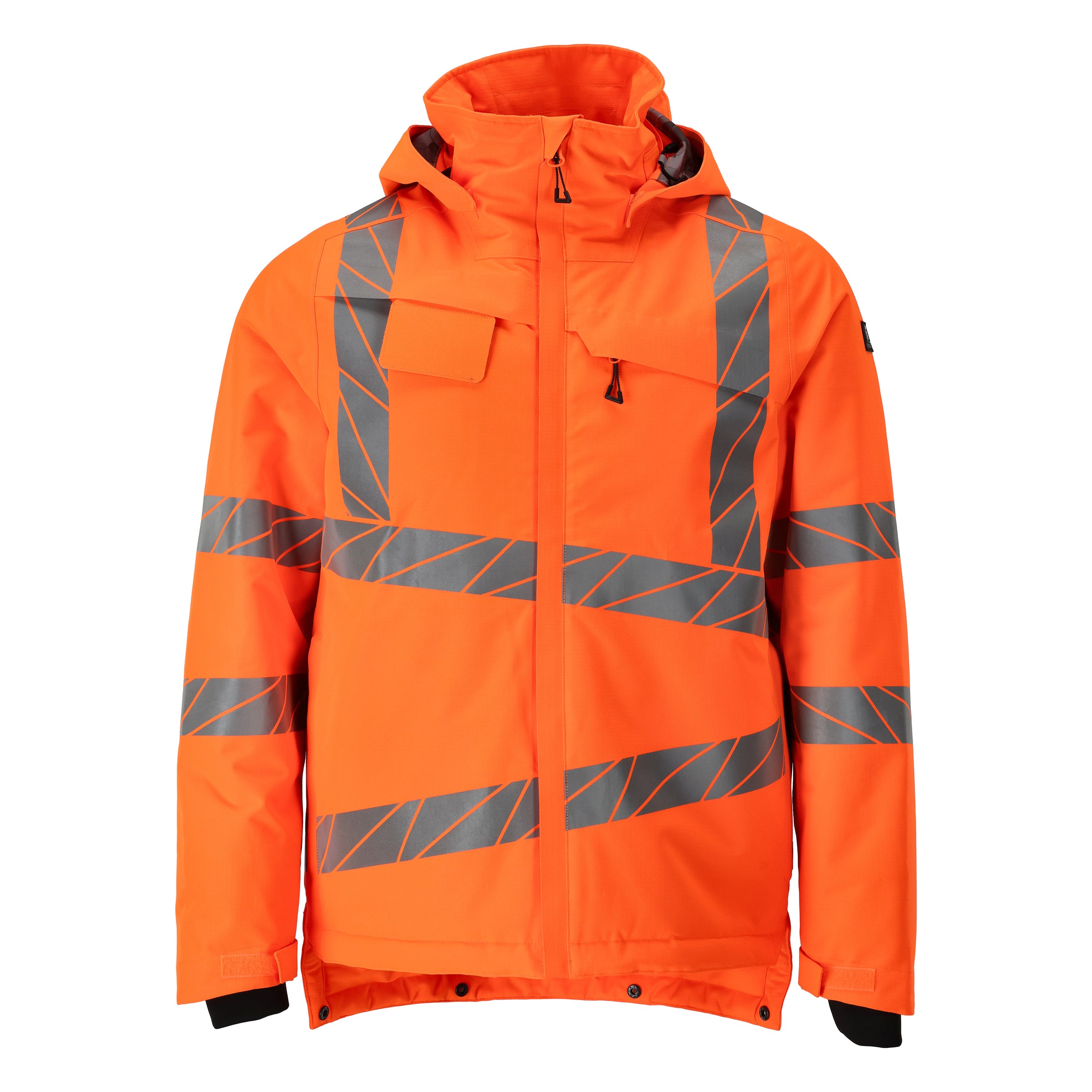 Fluorescent and with vertical and oblique, transverse reflective strips. The fabric is highly durable, breathable, wind and waterproof. CLIMASCOT® Lightweight Insulation. Taped seams. Detachable lined hood with adjustable drawstring. Fastening with zip and double storm flap. Inner pockets - two with zips and one open mesh. Detachable ID card holder. Chest pocket with a zip. Front pockets with a zip. High collar. Rib inside the bottom trim on the front of the jacket. Flap on back of jacket can be folded up for standard back length or released for extended back. Rib (hidden in storm flap) at cuffs. Hook and loop band fastening at cuffs. Zip at lower back for logo printing/ embroidery.