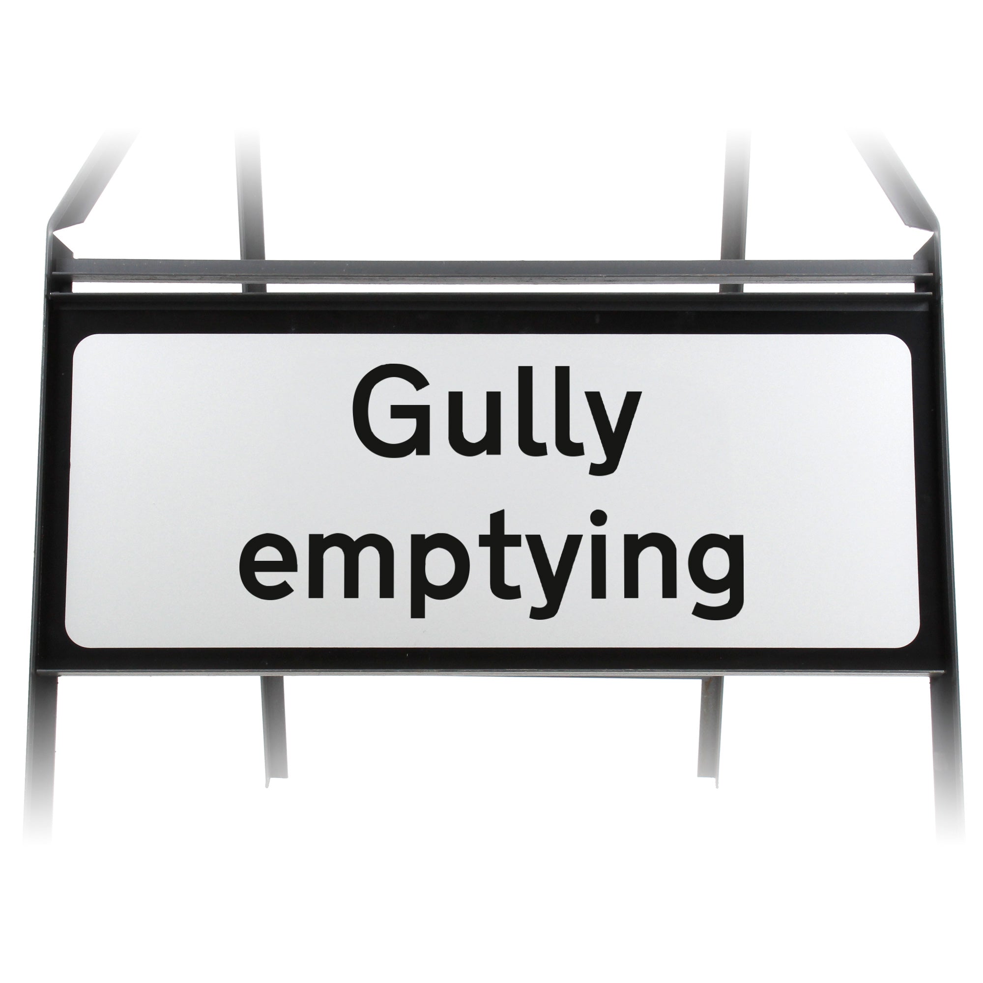 A 'Gulley Emptying' supplementary plate for the 750mm metal road sign range. Designed to warn oncoming traffic that gully emptying is taking place.