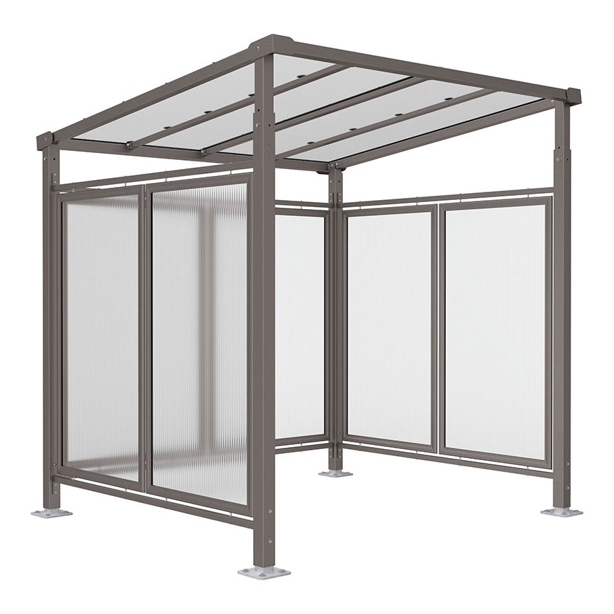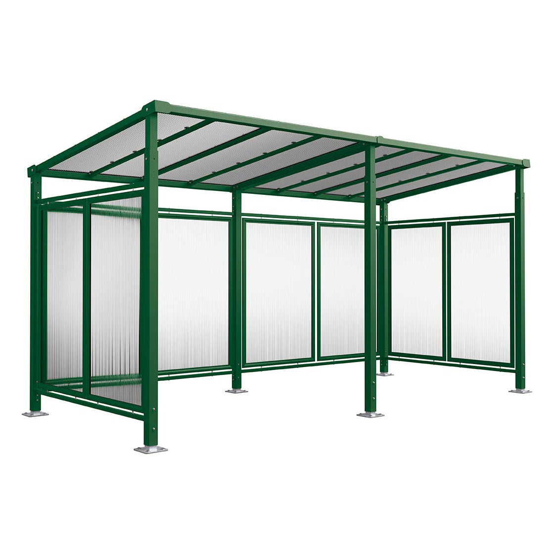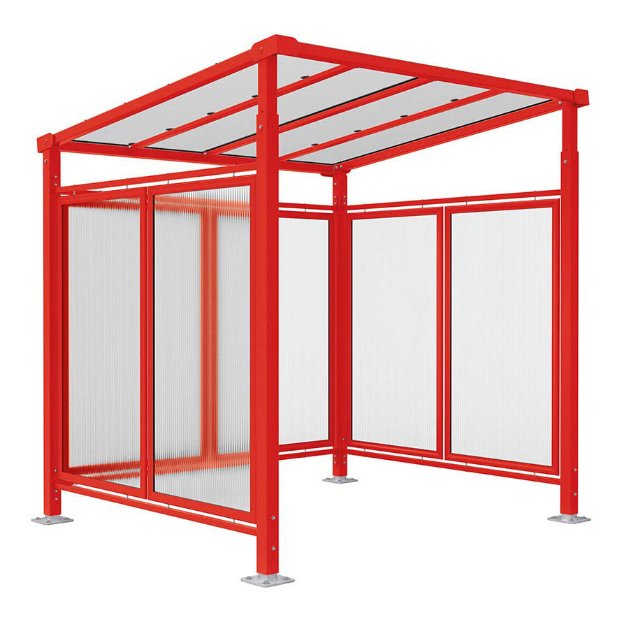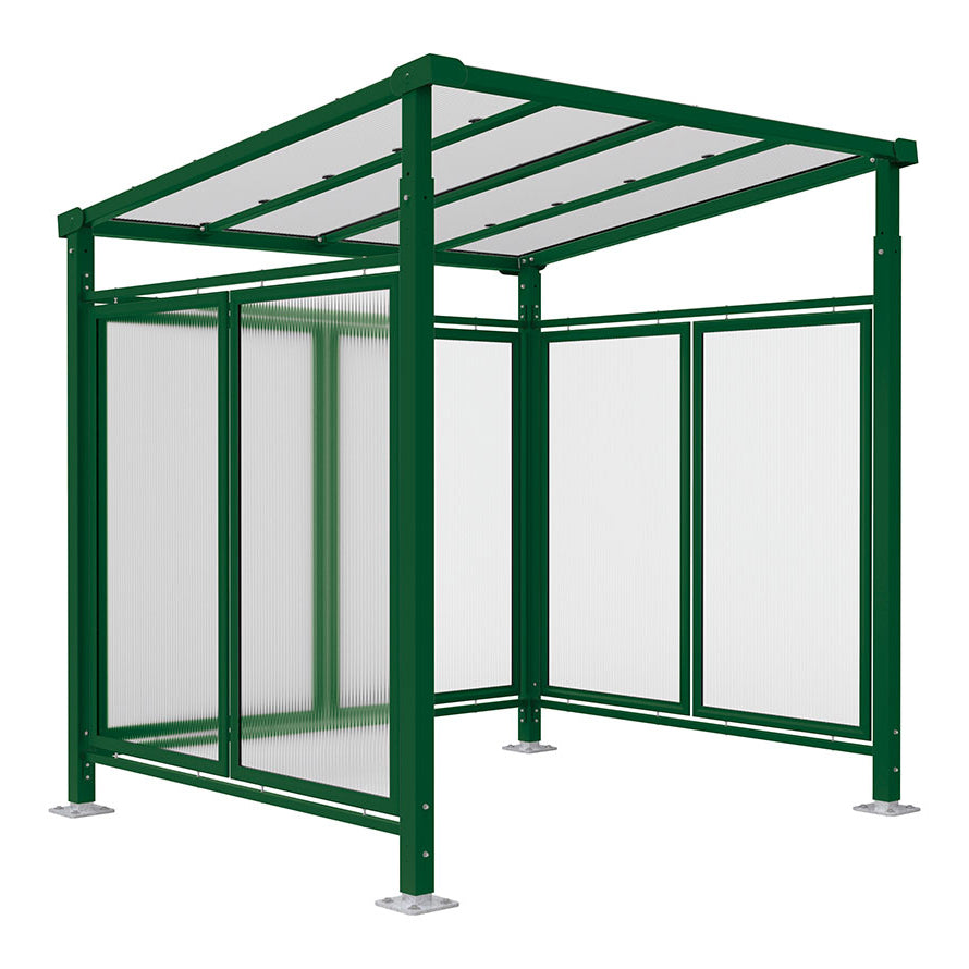 This shelter comes complete with side and rear cladding panels. The upper back and side wind deflector panels can be purchased as a separate item if required. The transparent side, rear and roof panels come complete with colour coded frames and are made from a 10mm anti UV polycarbonate.