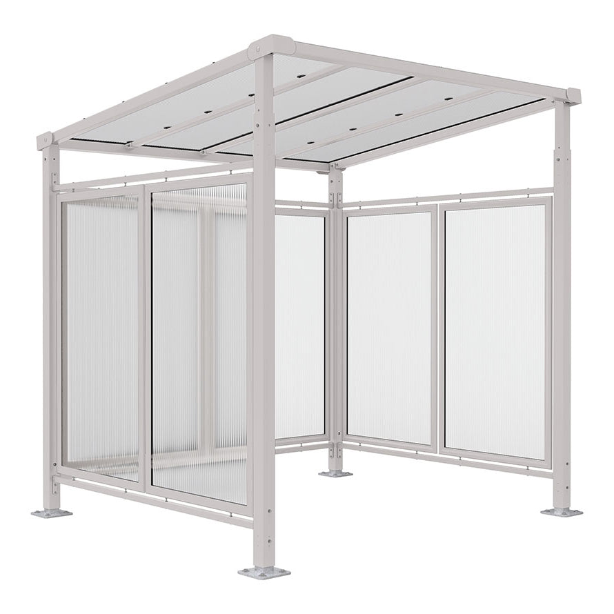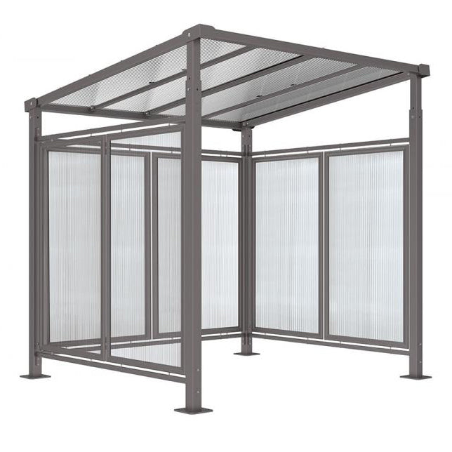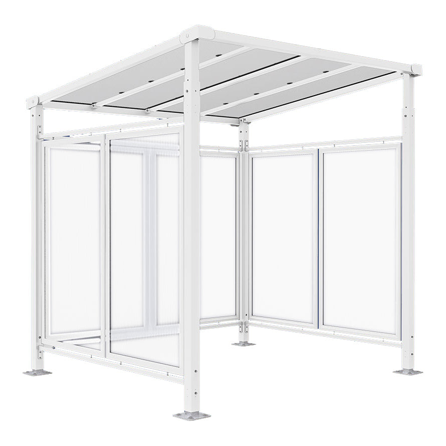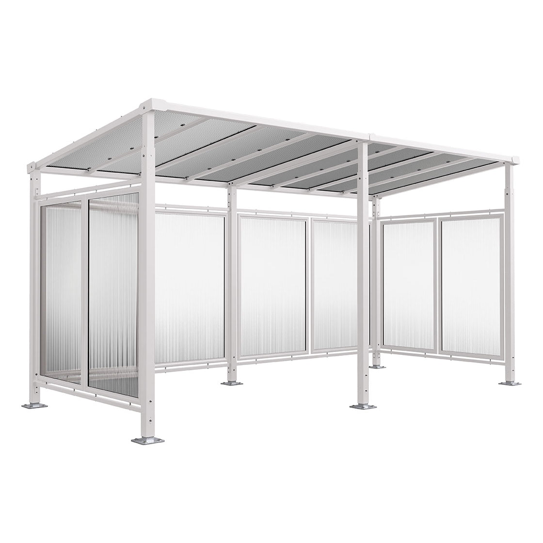 This shelter comes complete with side and rear cladding panels. The upper back and side wind deflector panels can be purchased as a separate item if required. The transparent side, rear and roof panels come complete with colour coded frames and are made from a 10mm anti UV polycarbonate.